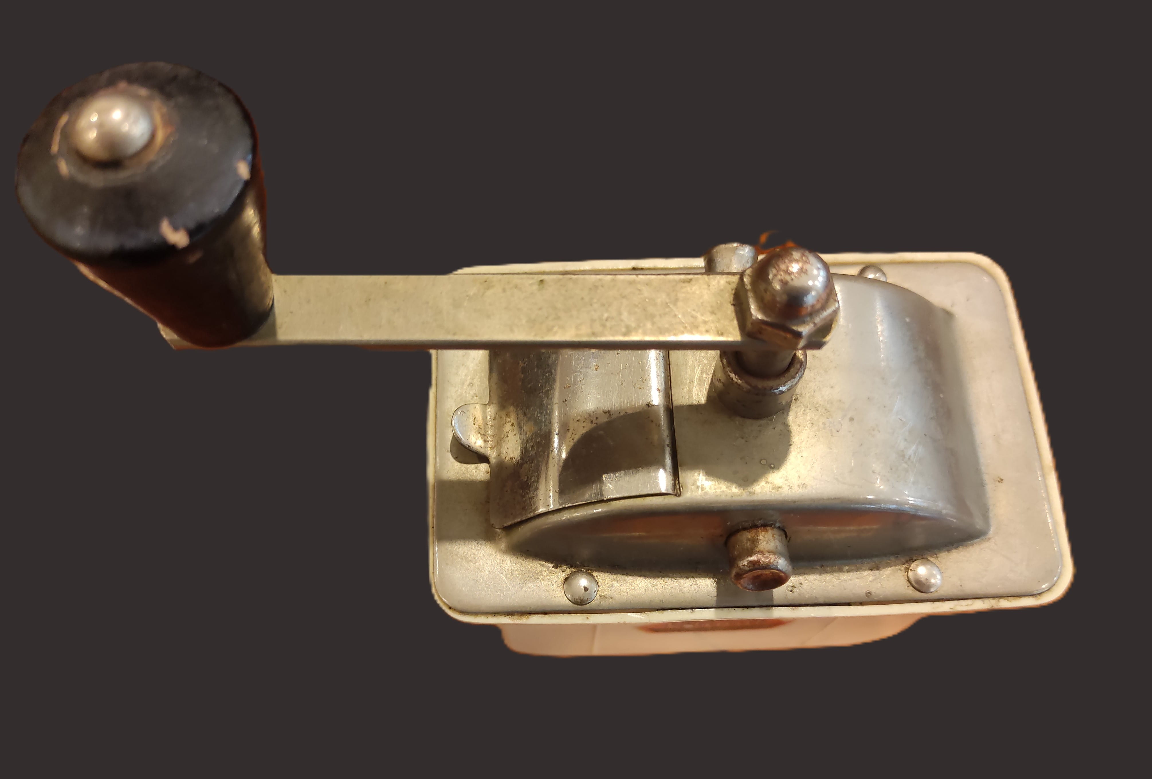 Mekanizma: Üstten kollu, çevirme kolunun ucu siyah ahşap tutma saplıdır.