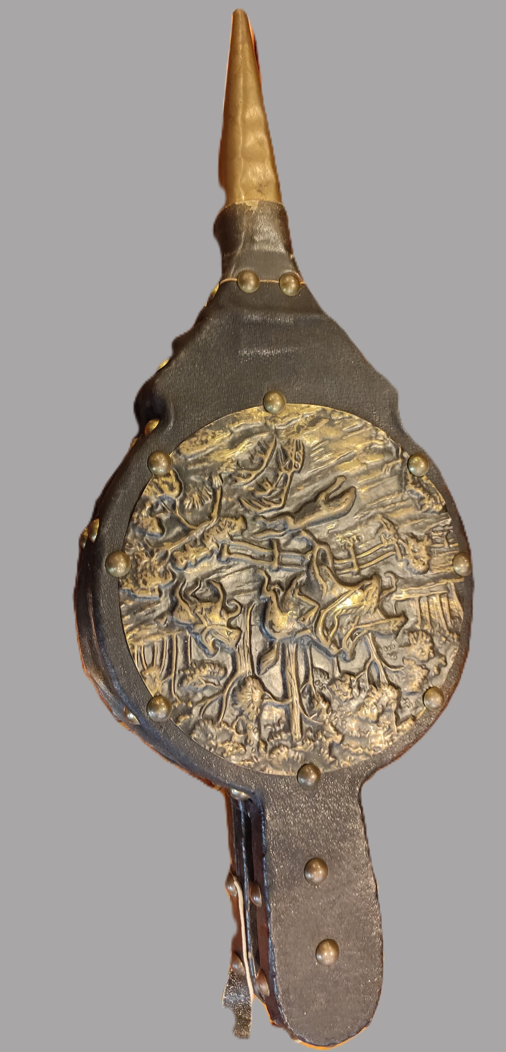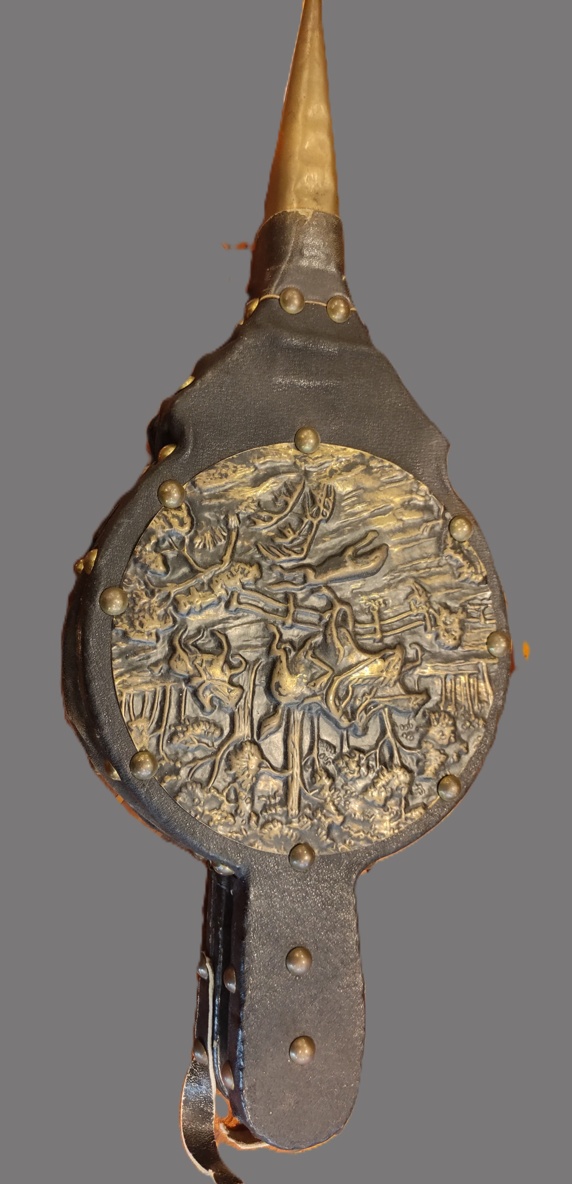 Kondisyon: Deri kısımları sağlam, pirinç yüzeydeki detaylar net ve belirgindir. Ucundaki metal üfleme ucu orijinal yapısını korumaktadır.