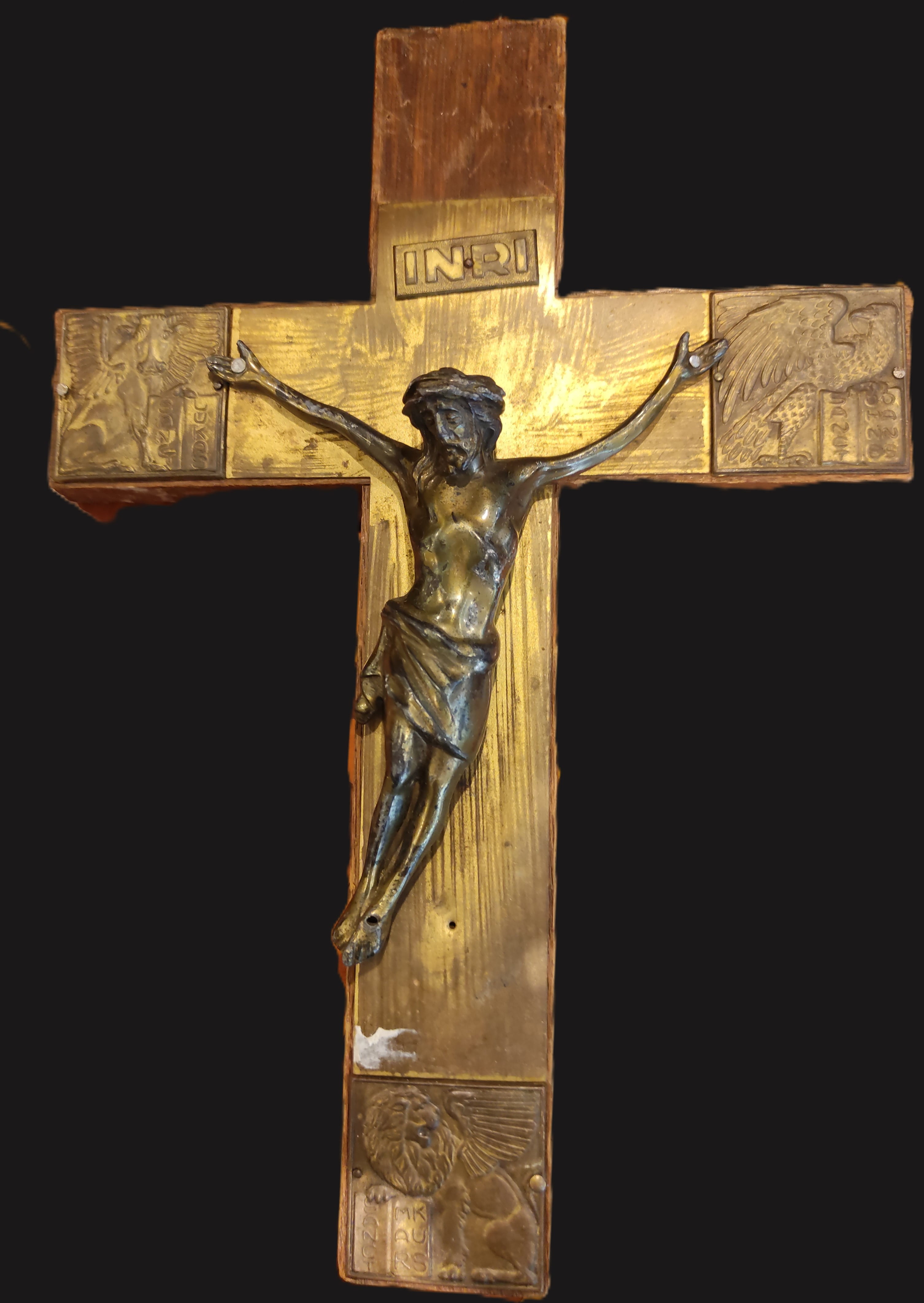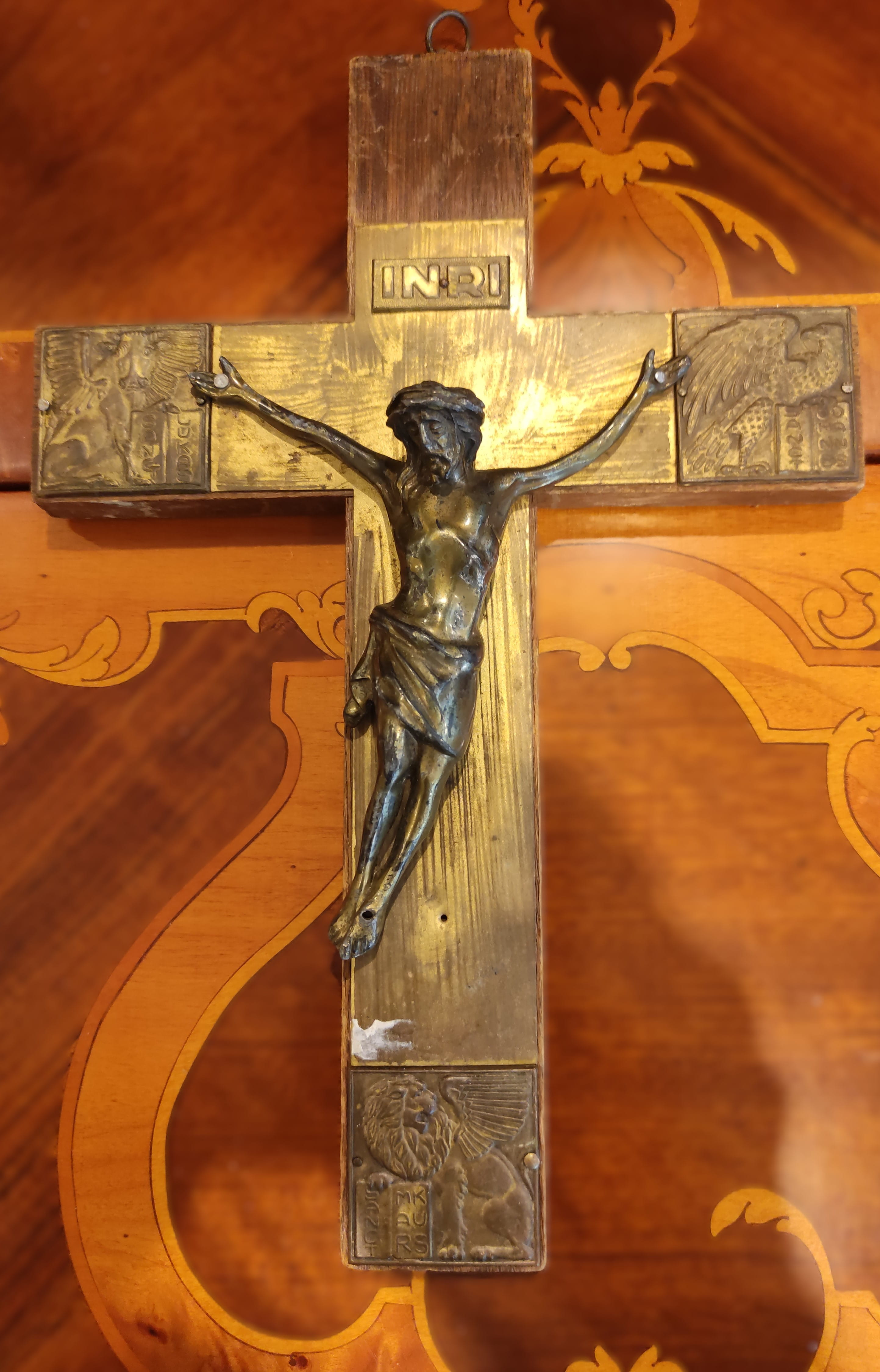 Antika Pirinç Kaplama Ahşap Haç (Kruvafiks) – Dört İncil Yazarı Sembollü