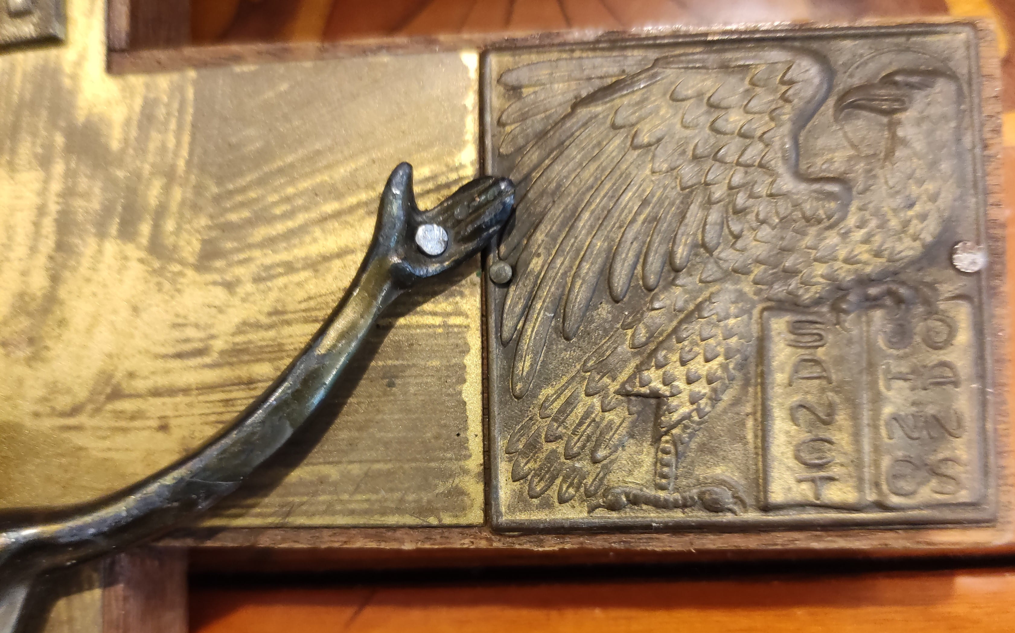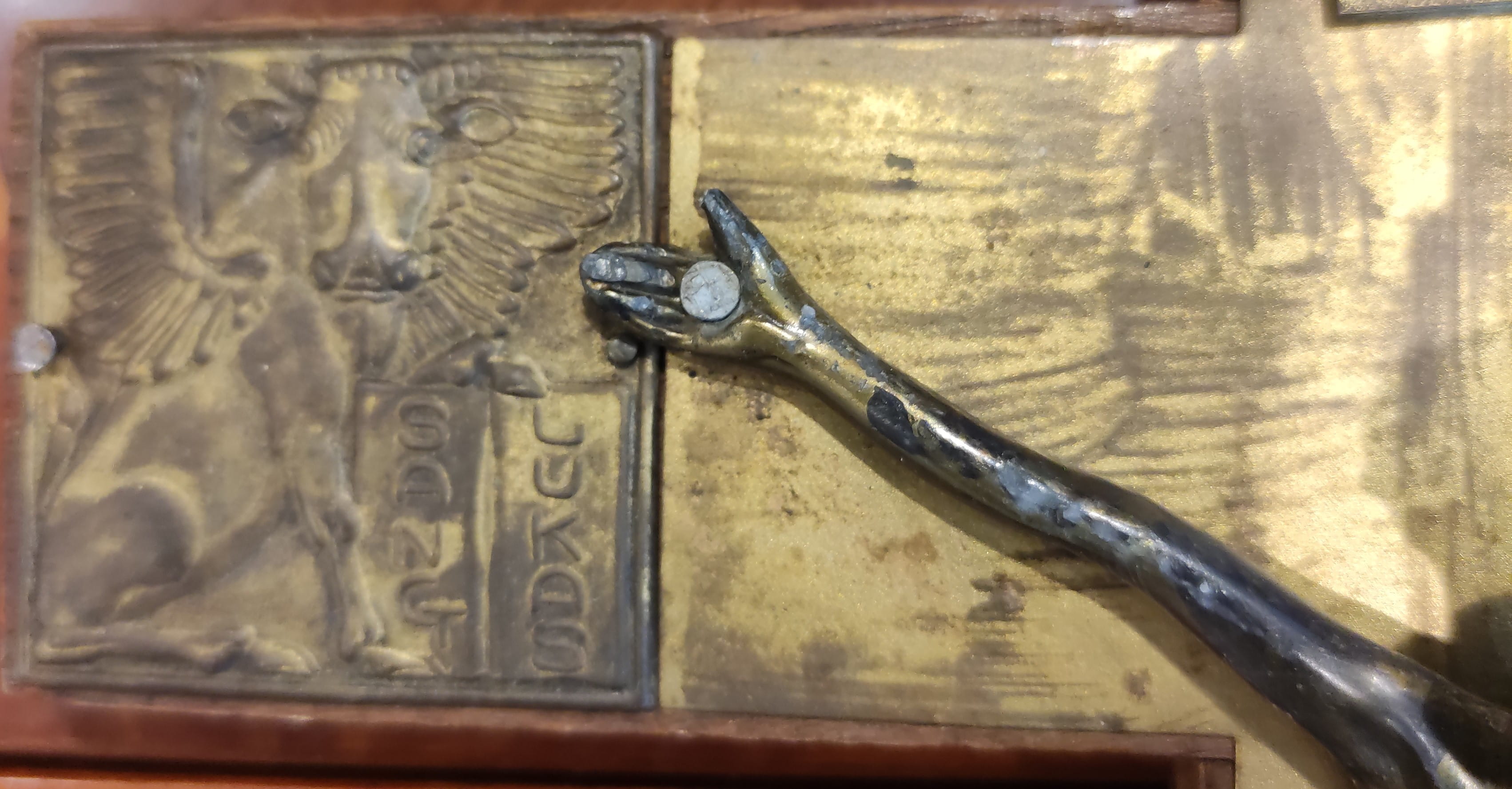 Malzeme: Masif ahşap kaide ve metal (muhtemelen pirinç veya bronz alaşım) aplikeler.