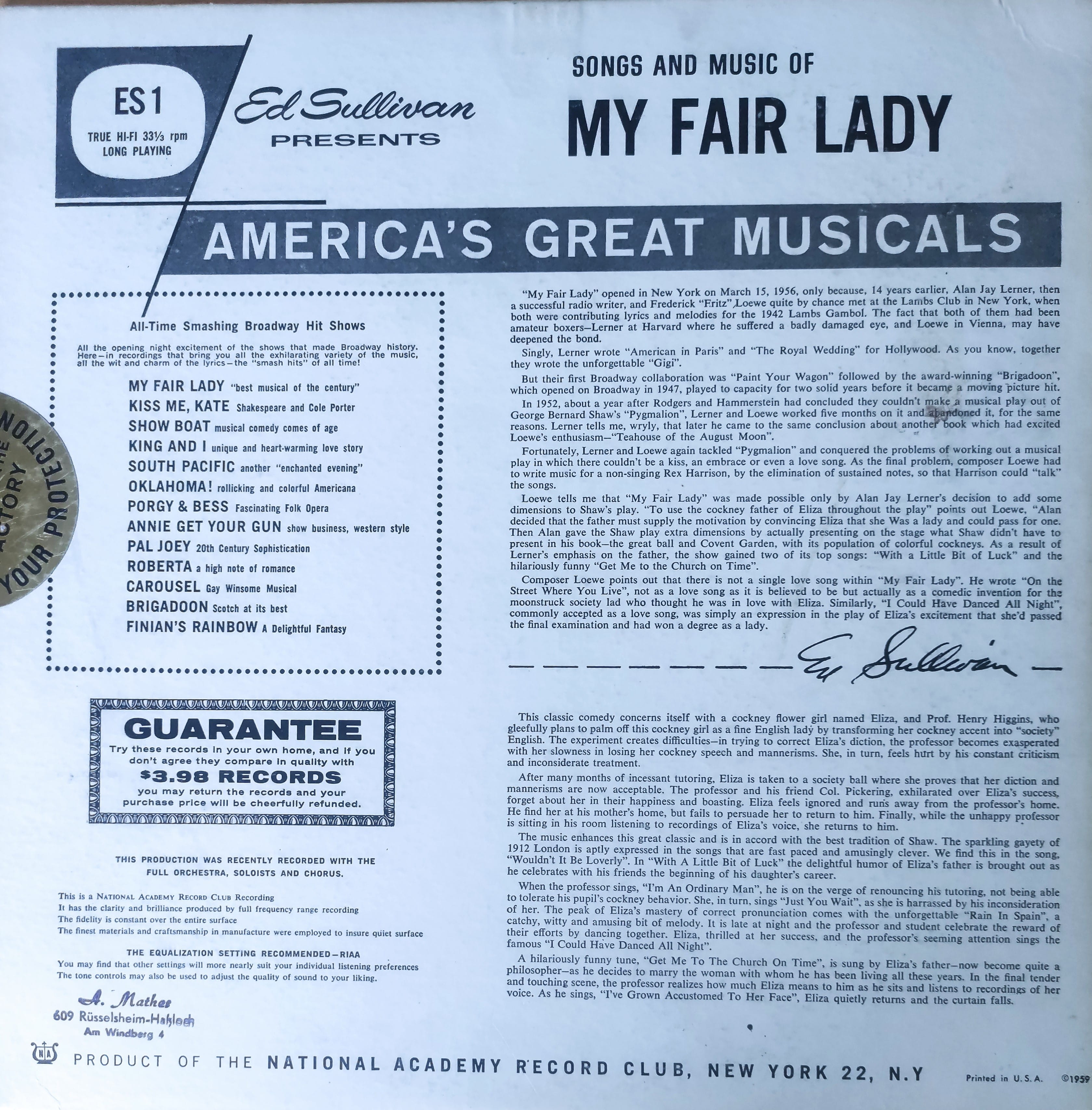Arka Kapak Detayı: Plağın arka kısmında müzikalin hikayesi, şarkı listesi ve Ed Sullivan’ın imzalı sunum metni bulunmaktadır. Ayrıca National Academy Record Club’ın kalite garantisi ve dönemin diğer hit şovlarının listesi yer almaktadır.
