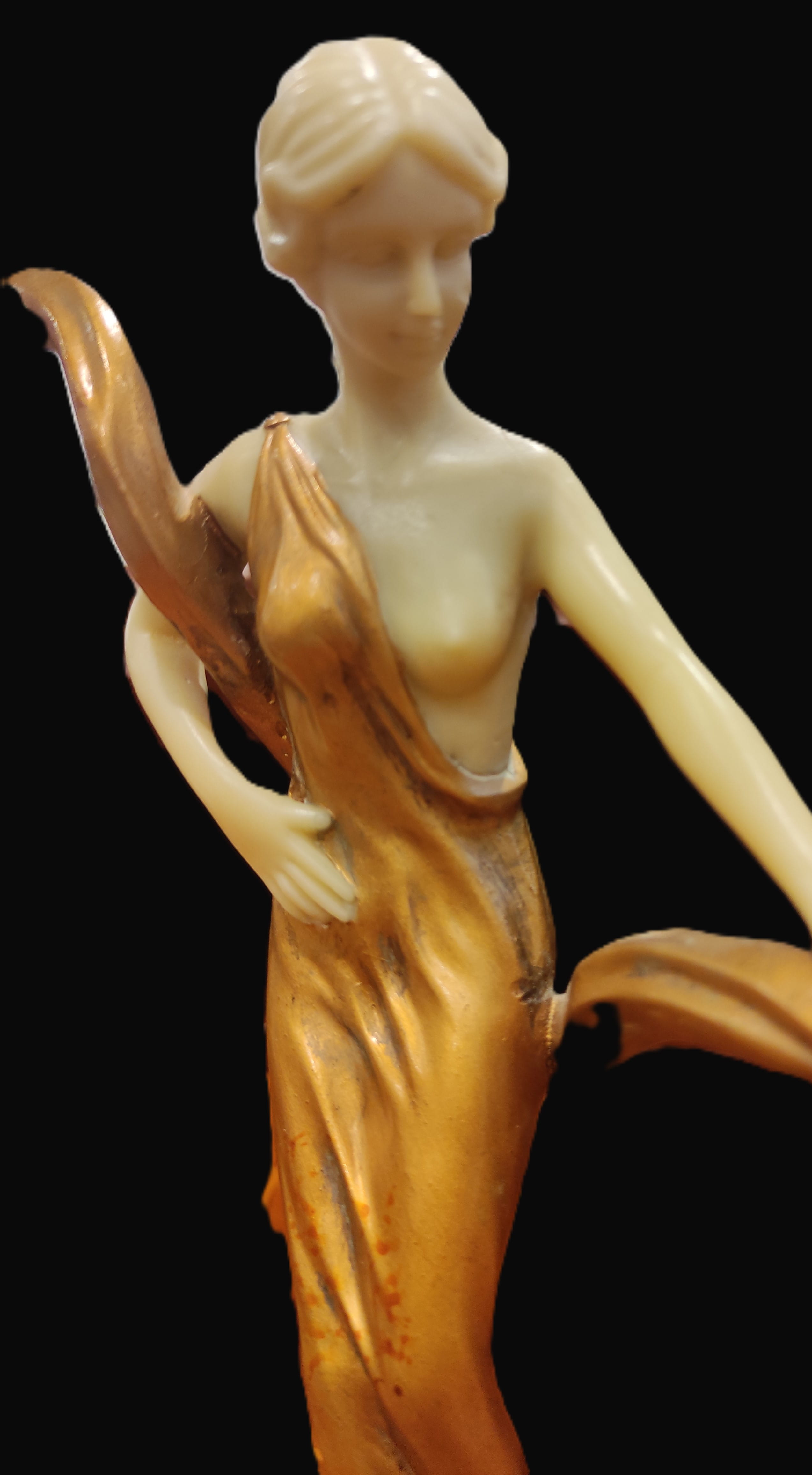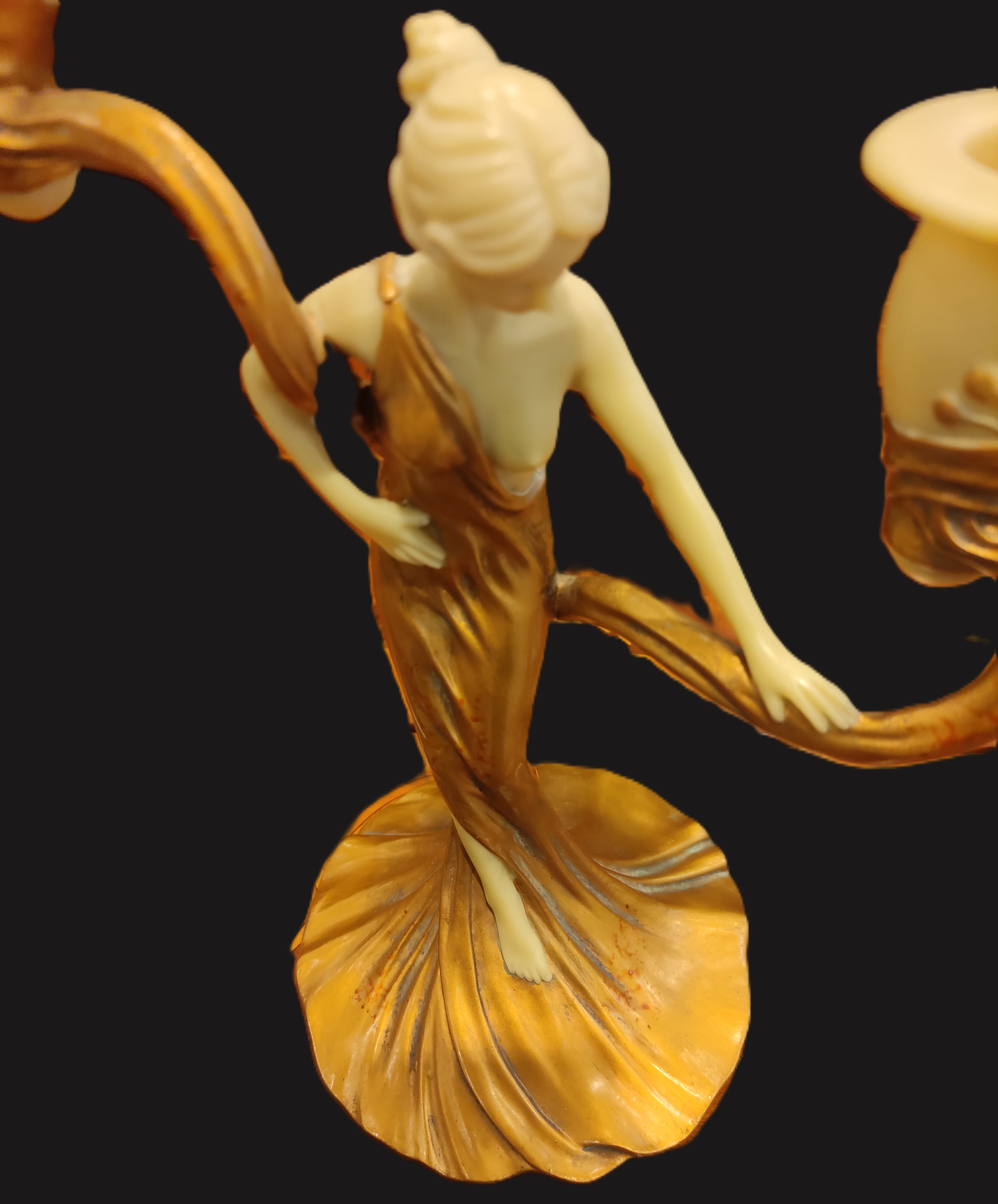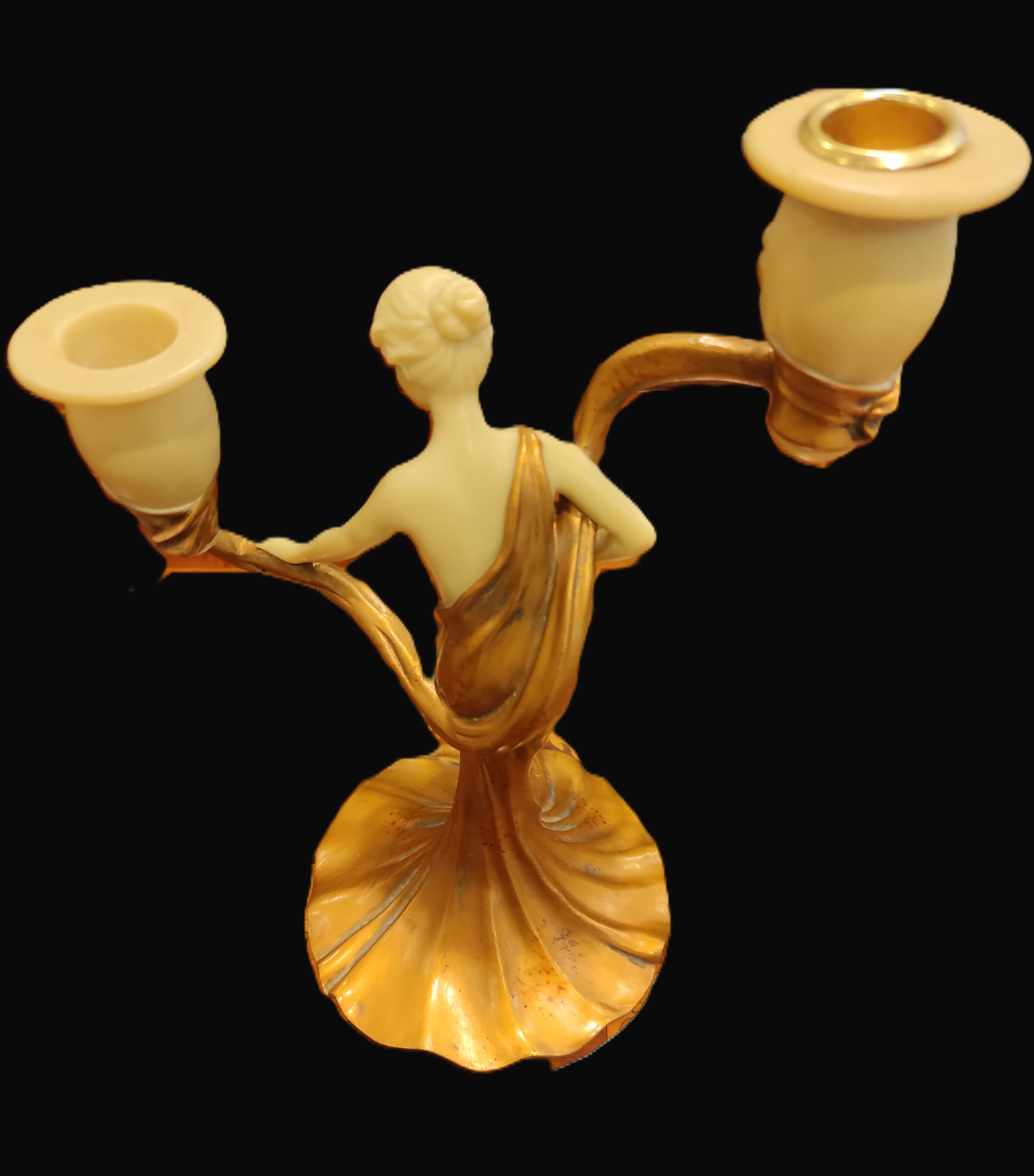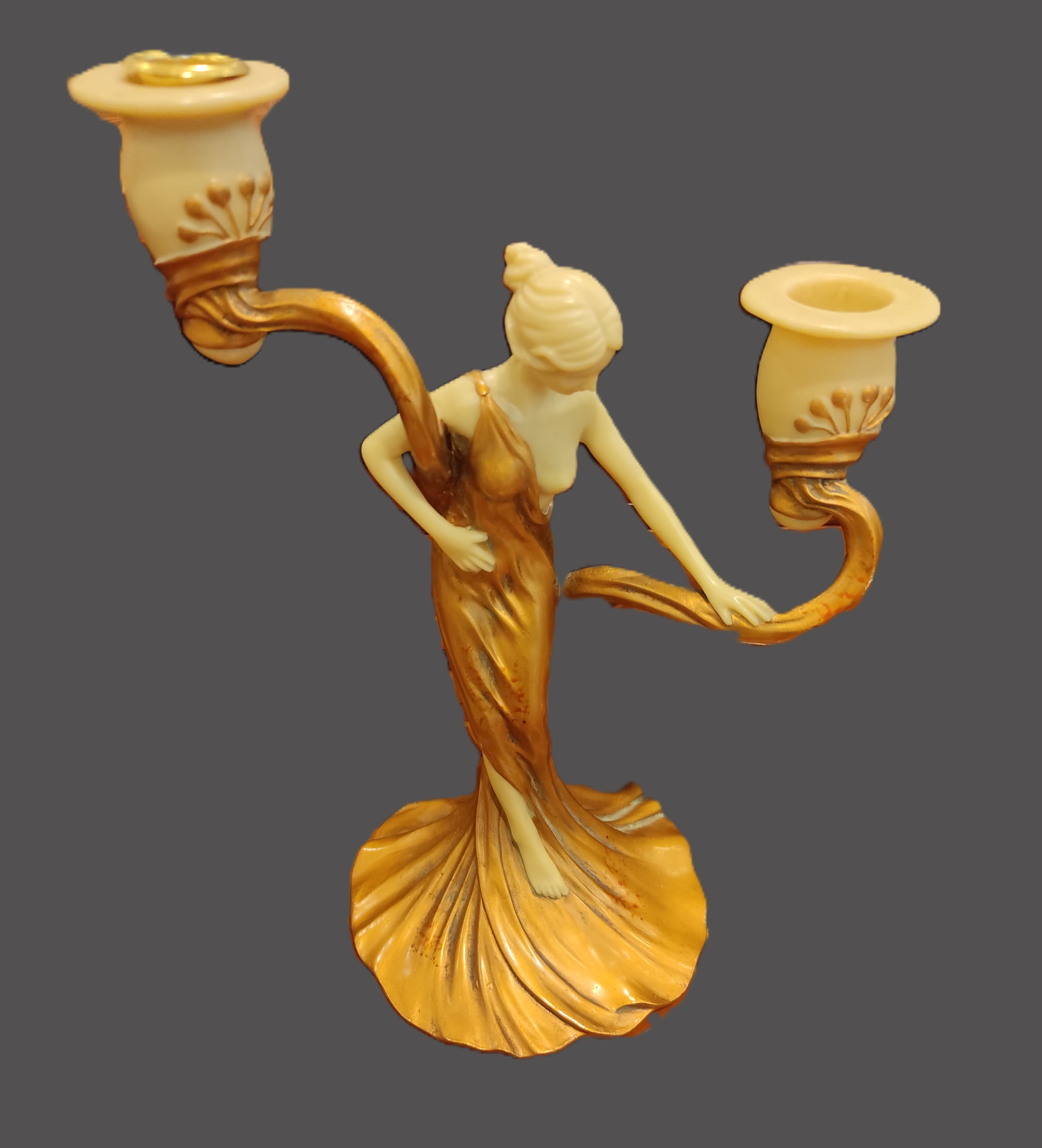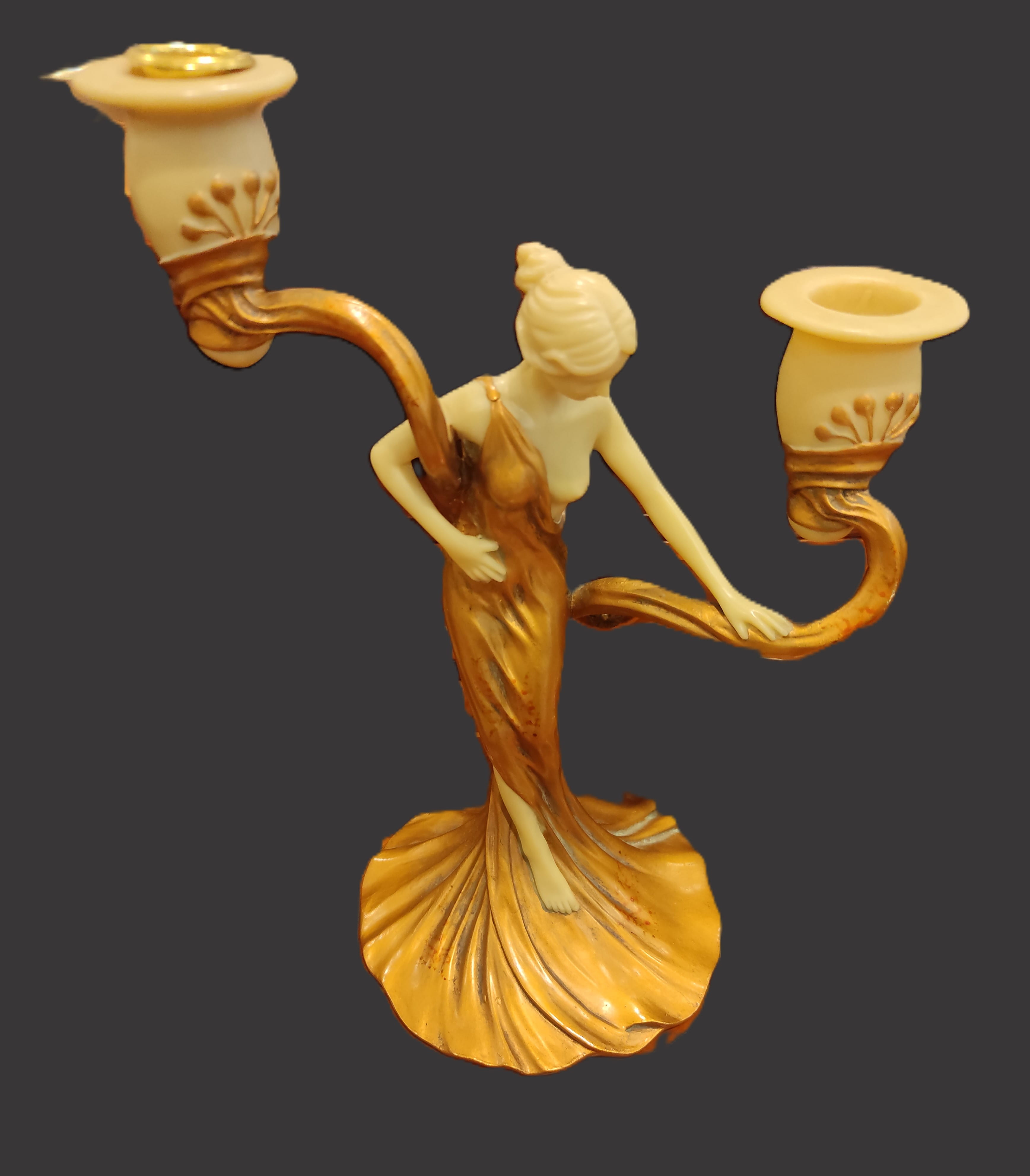 Art Nouveau akımının zarafetini yansıtan, estetik tasarımıyla göz kamaştıran bu ikili şamdan, dekorasyonuna klasik bir dokunuş katmak isteyenler için nadide bir parçadır. Şamdanın merkezinde, akışkan formda altın sarısı bir elbise içinde tasvir edilmiş, zarif bir kadın figürü yer almaktadır.
