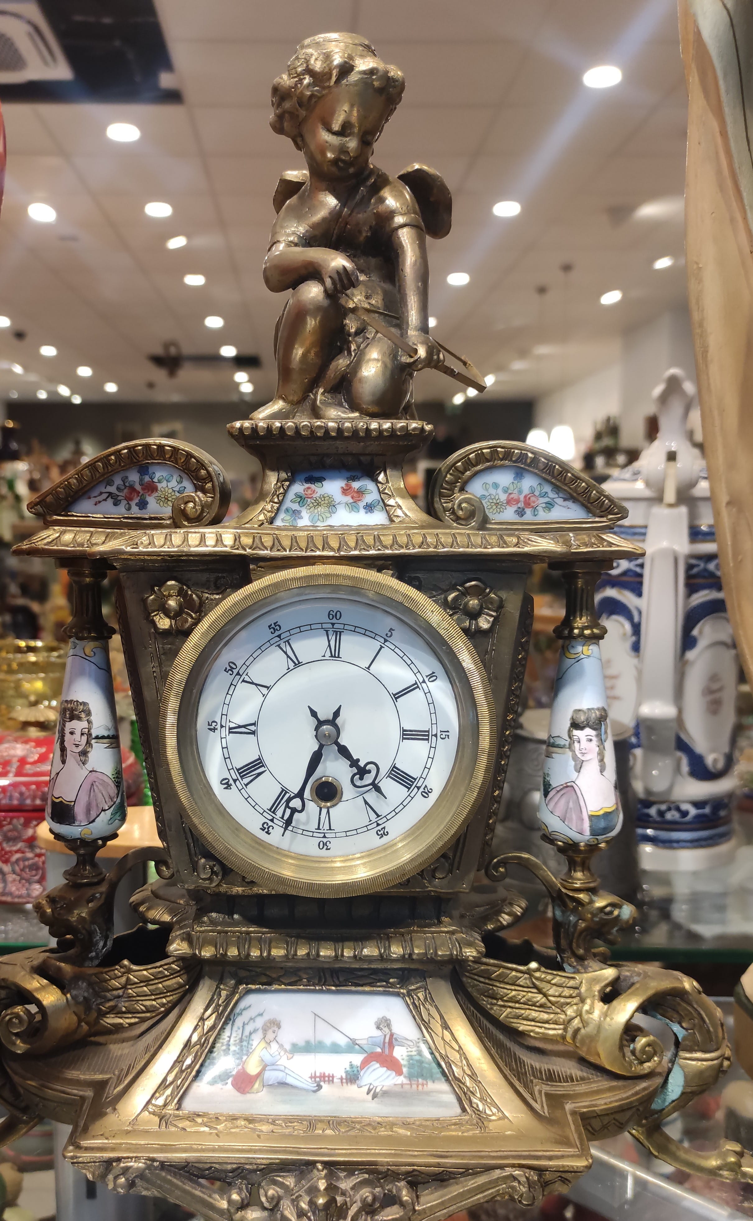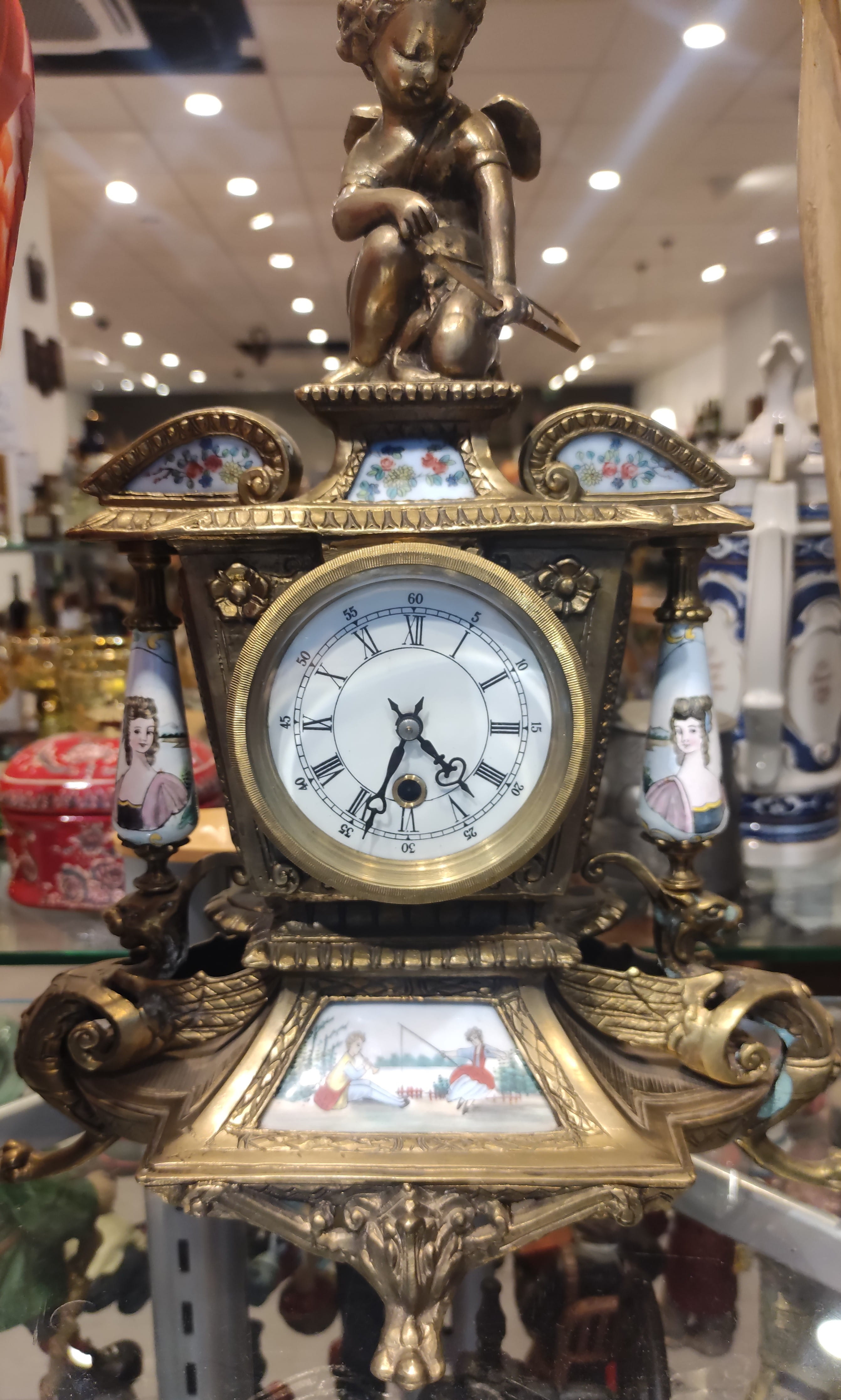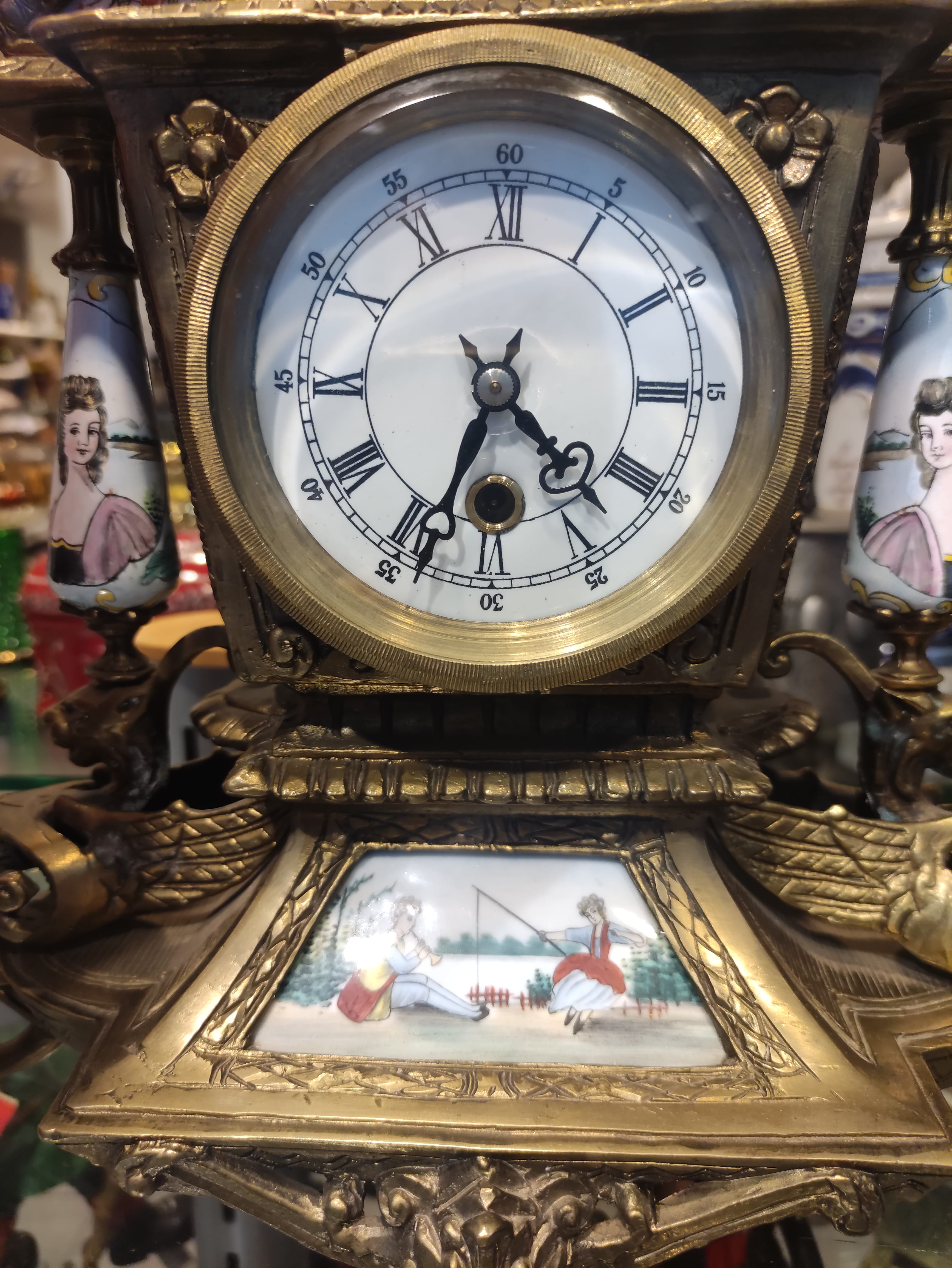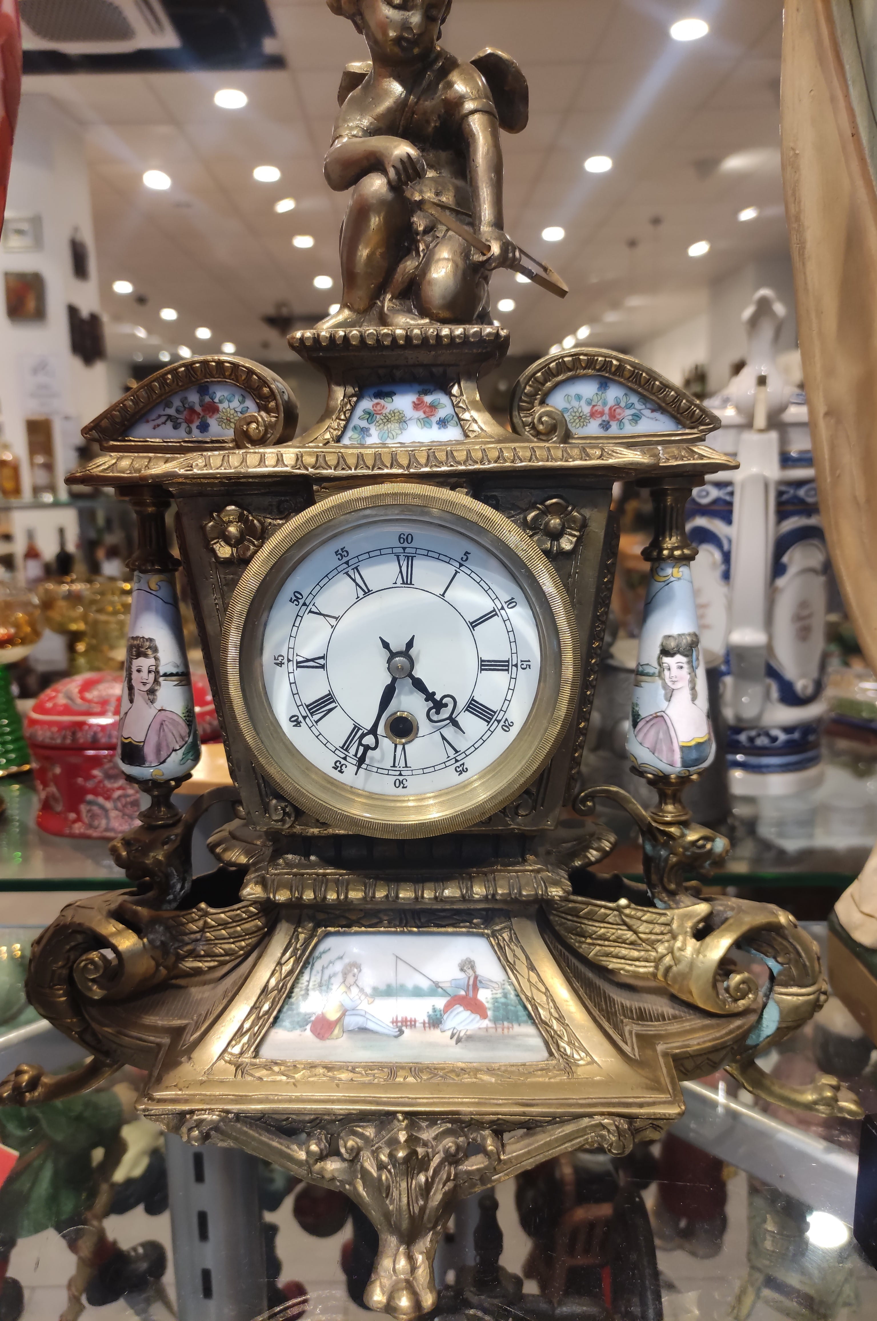 Bronz Kaplama ve El Boyaması Porselen Plakalı Antİka Şömine Saatİ