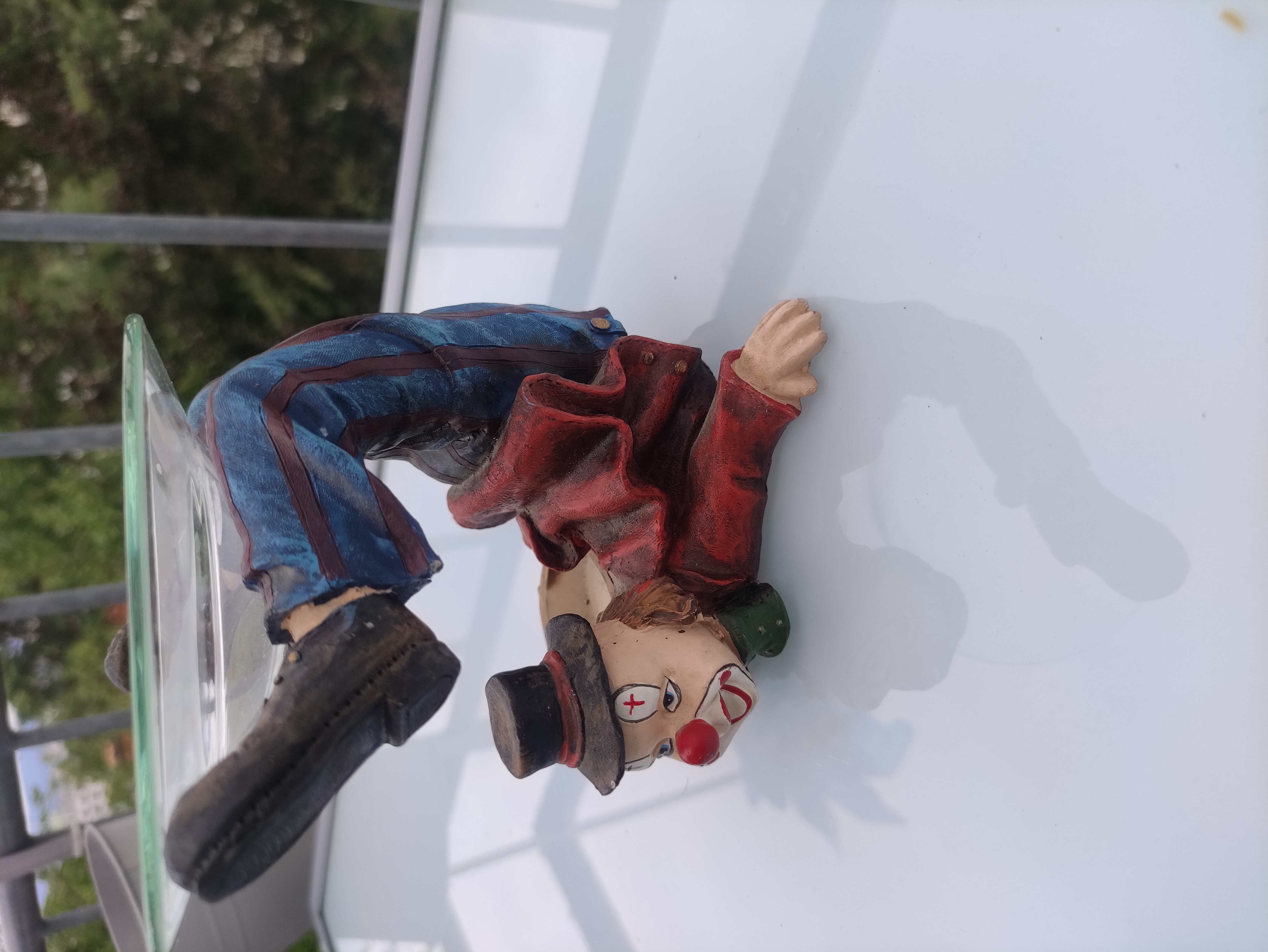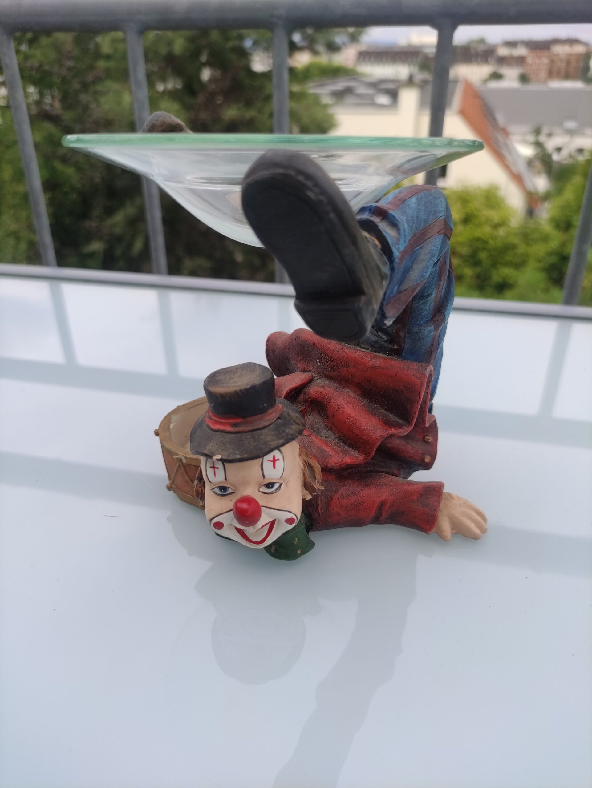 Satışa sunulan bu zarif palyaço figürü, üst kısmında çıkarılabilir cam kaseye sahiptir ve isteğe bağlı olarak buhurdanlık olarak da kullanılabilir. Hem dekoratif hem de işlevsel olan bu parça, evinize neşeli bir atmosfer katar. Cam kase kolayca temizlenebilir. Koleksiyoncular ve dekorasyon tutkunları için şık bir seçimdir.