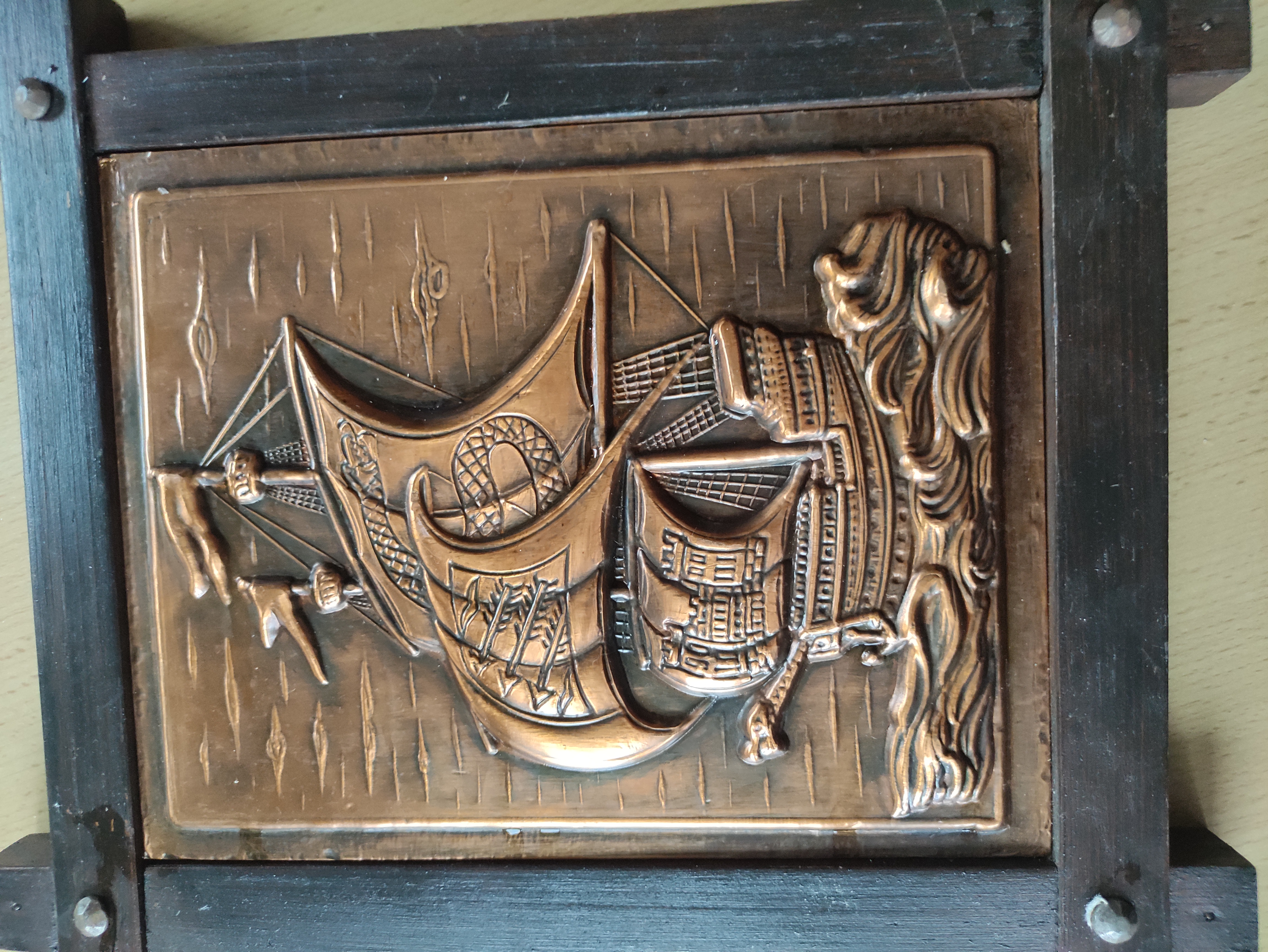 Geleneksel bakır işleme sanatının en güzel örneklerinden biri olan bu pano, detaylı işçiliği ve maskülen duruşuyla mekanınıza derinlik katacak. Yelkenli gemi figürü, dalgalar ve gökyüzü detayları kabartma (rölyef) tekniğiyle büyük bir titizlikle işlenmiştir.