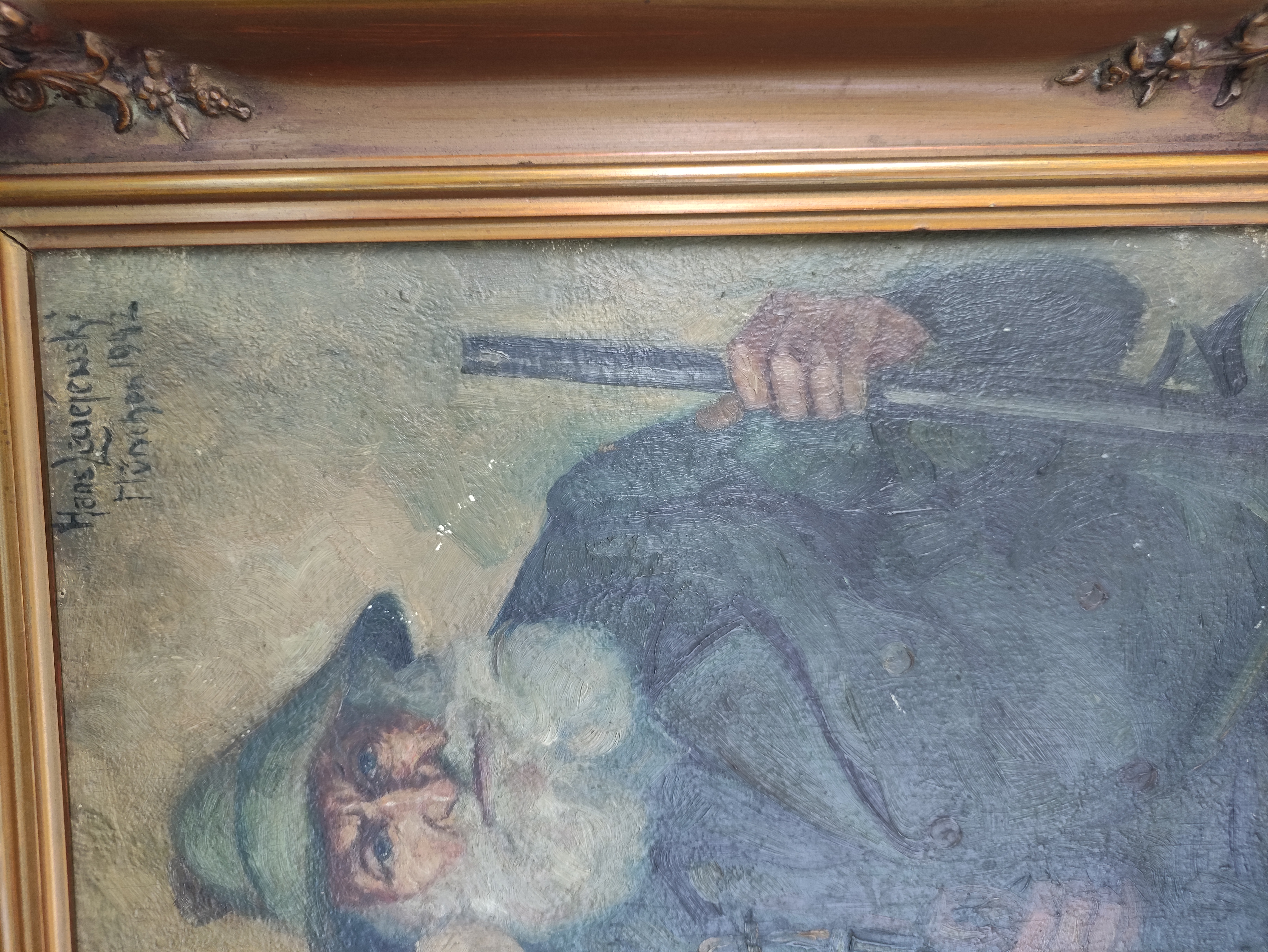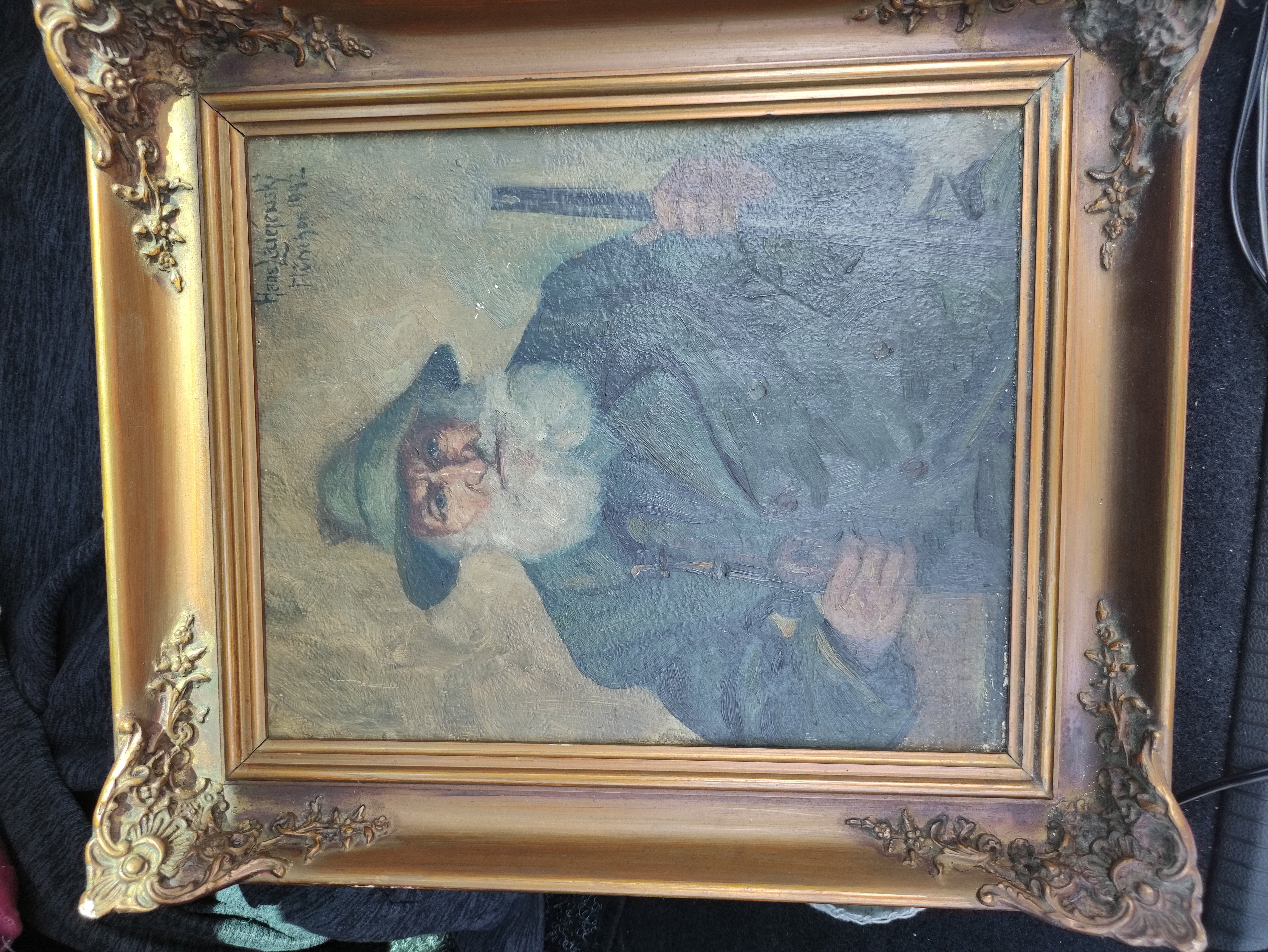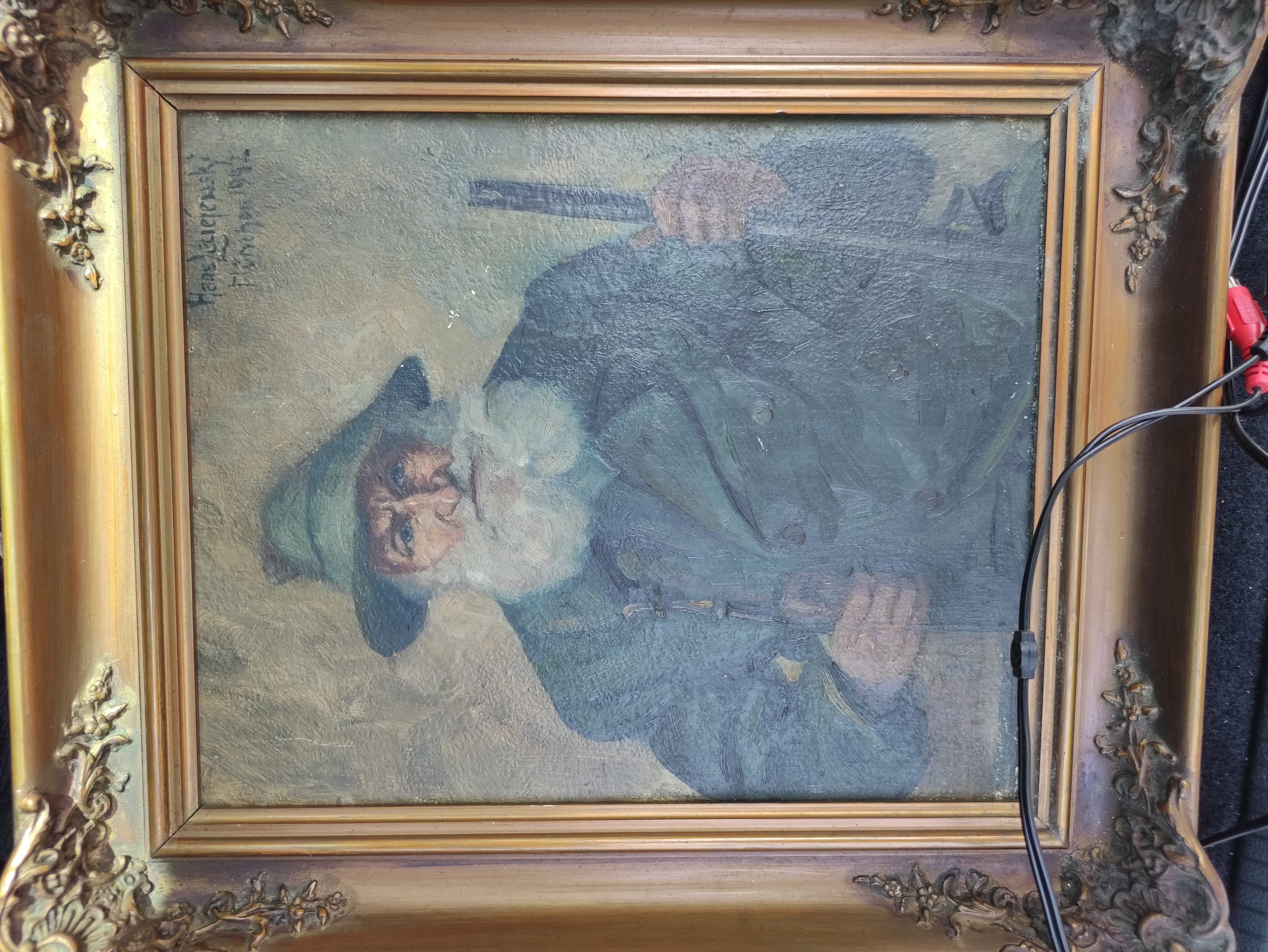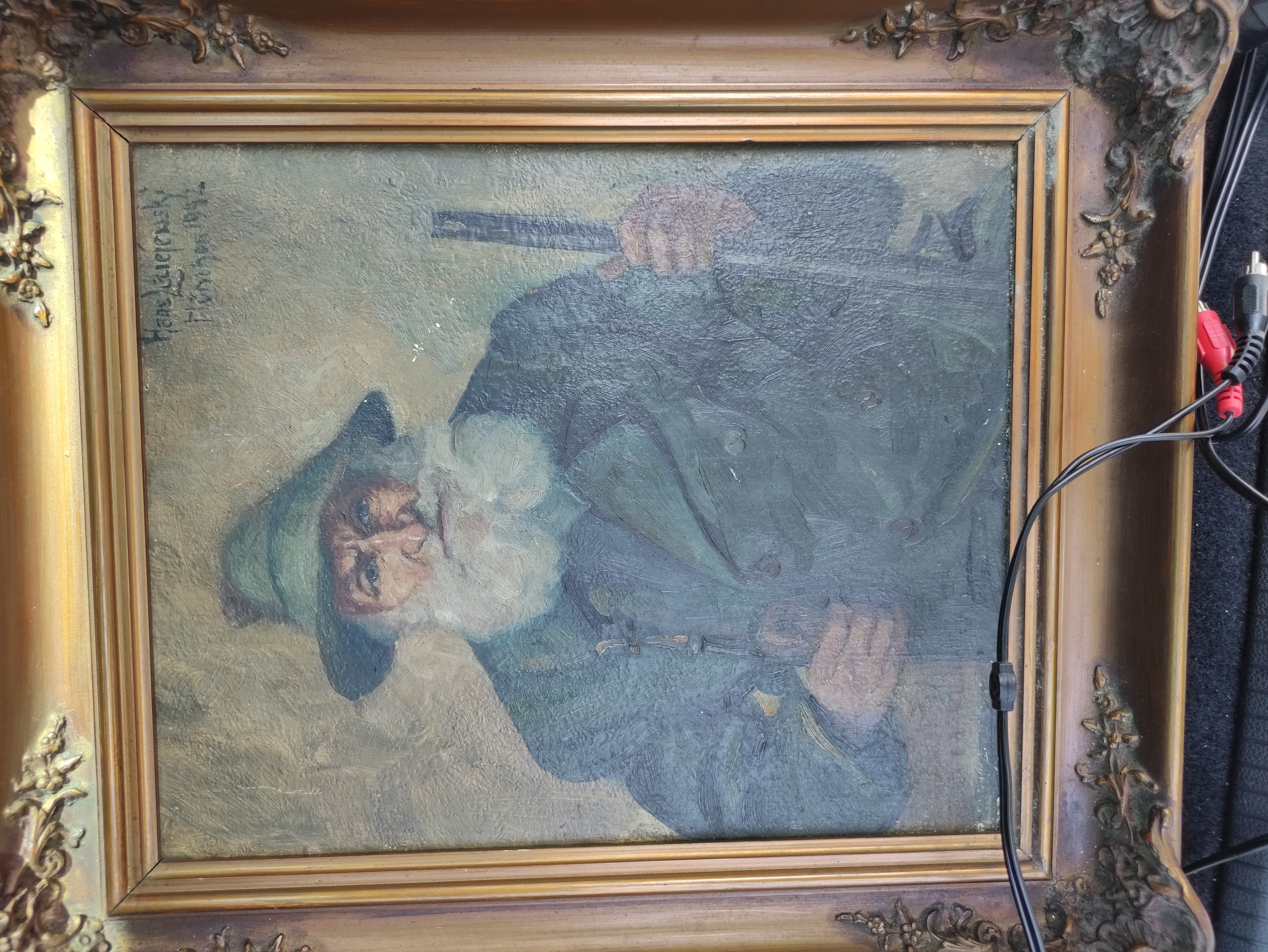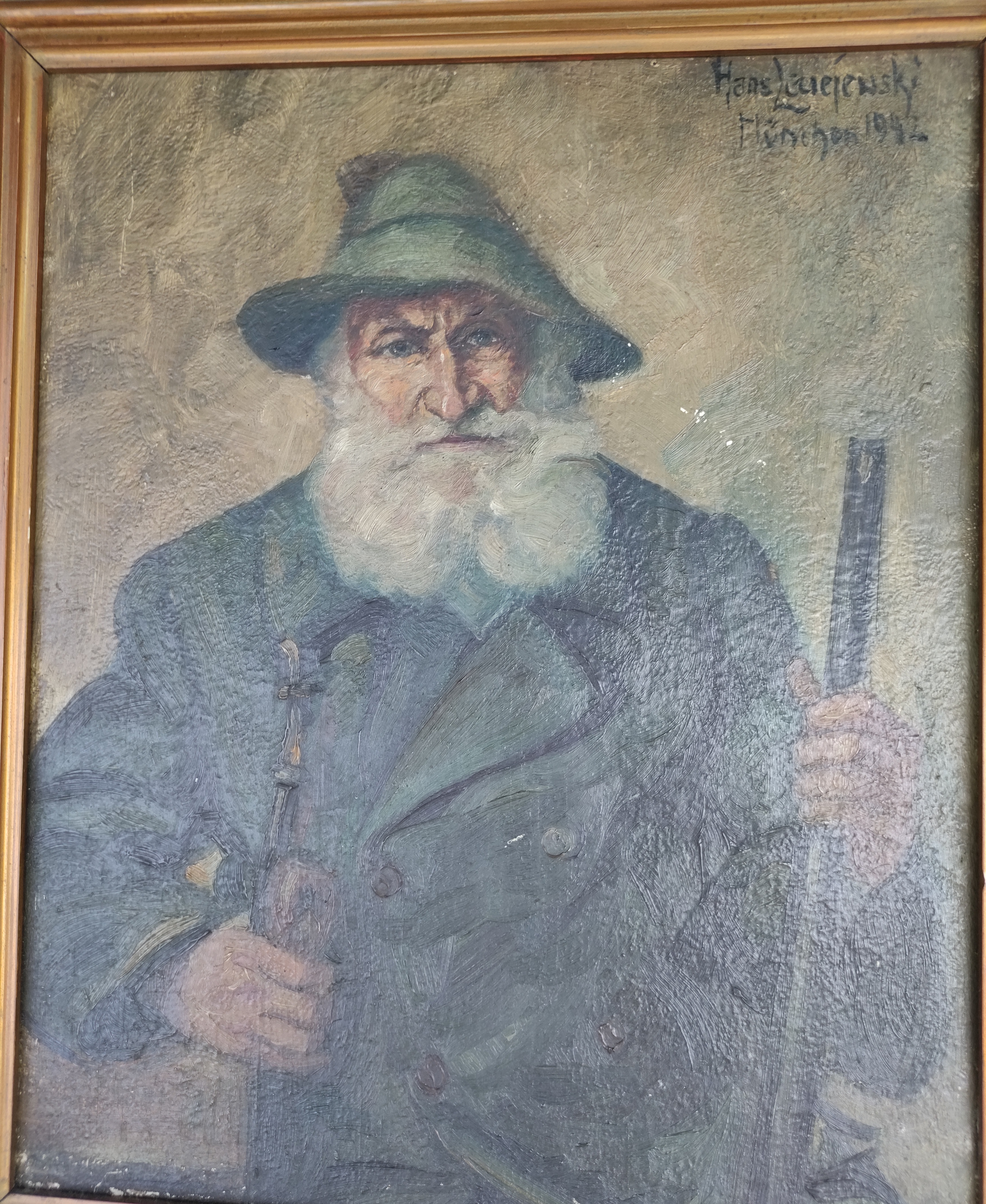 Orijinal, sanatçı tarafından imzalanmış ve 1942 yılında Münih’te tarihlenmiş Hans Leciejewski’ye ait ahşap üzerine yağlıboya tablo. Leciejewski, geç 19. ve erken 20. yüzyılın tanınmış Alman ressamlarından biridir ve insan, hayvan ile manzara konularındaki gerçekçi betimlemeleriyle bilinir. Bu eser, elinde baston ve pipo tutan yaşlı bir adamı – muhtemelen bir avcı veya çoban – detaylı işçiliği ve sıcak, özgün atmosferiyle resmediyor.