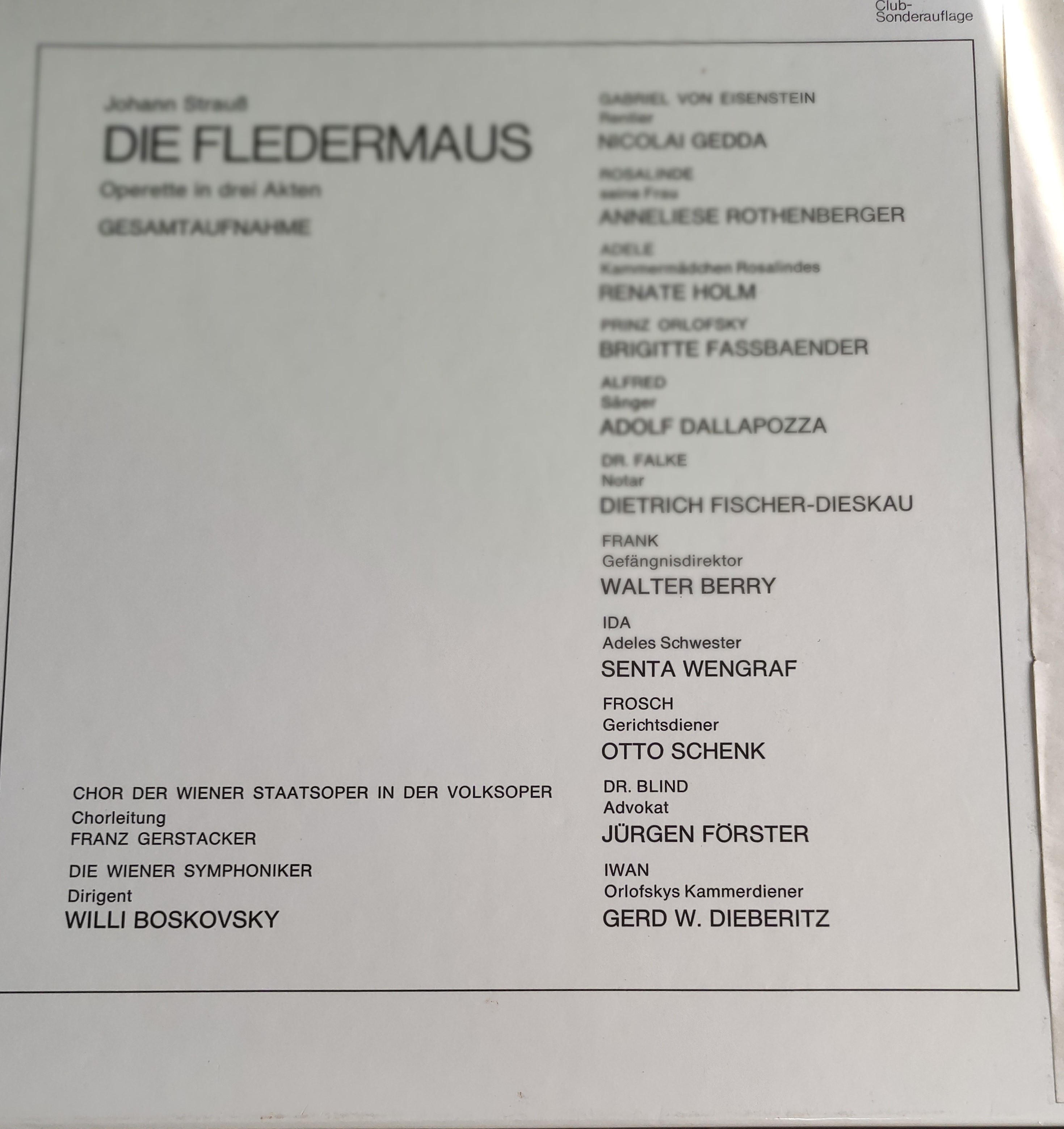 Klasik müzik koleksiyonunuza değer katacak, Johann Strauss’un ünlü opereti “Die Fledermaus”un tam kaydı LP plak olarak satışa sunulmaktadır. Plak, hem koleksiyonerler hem de klasik müzik severler için eşsiz bir parçadır. Kapak ve plak iyi korunmuş durumdadır, orijinal ses kalitesiyle keyifli bir dinleti sunar.