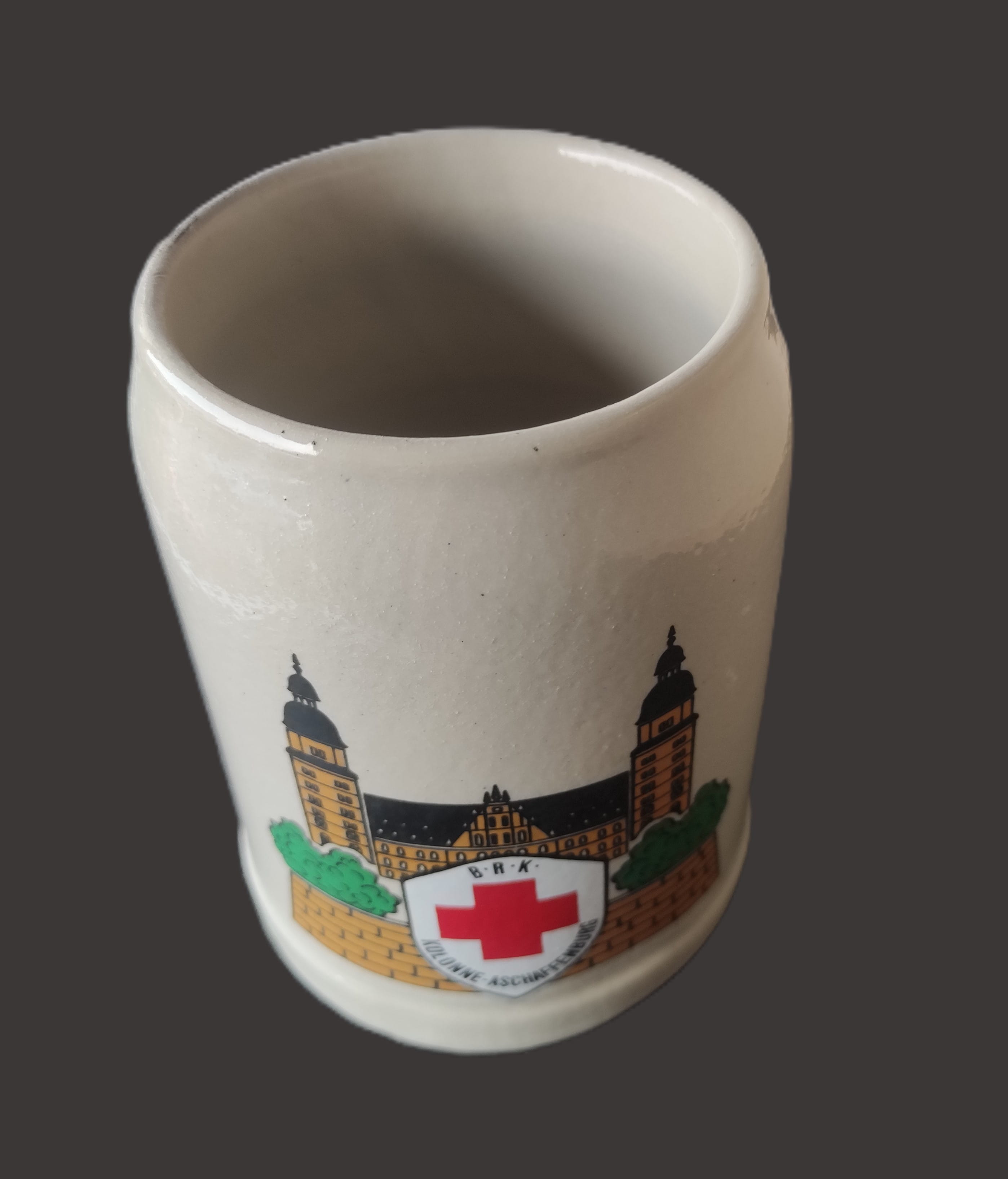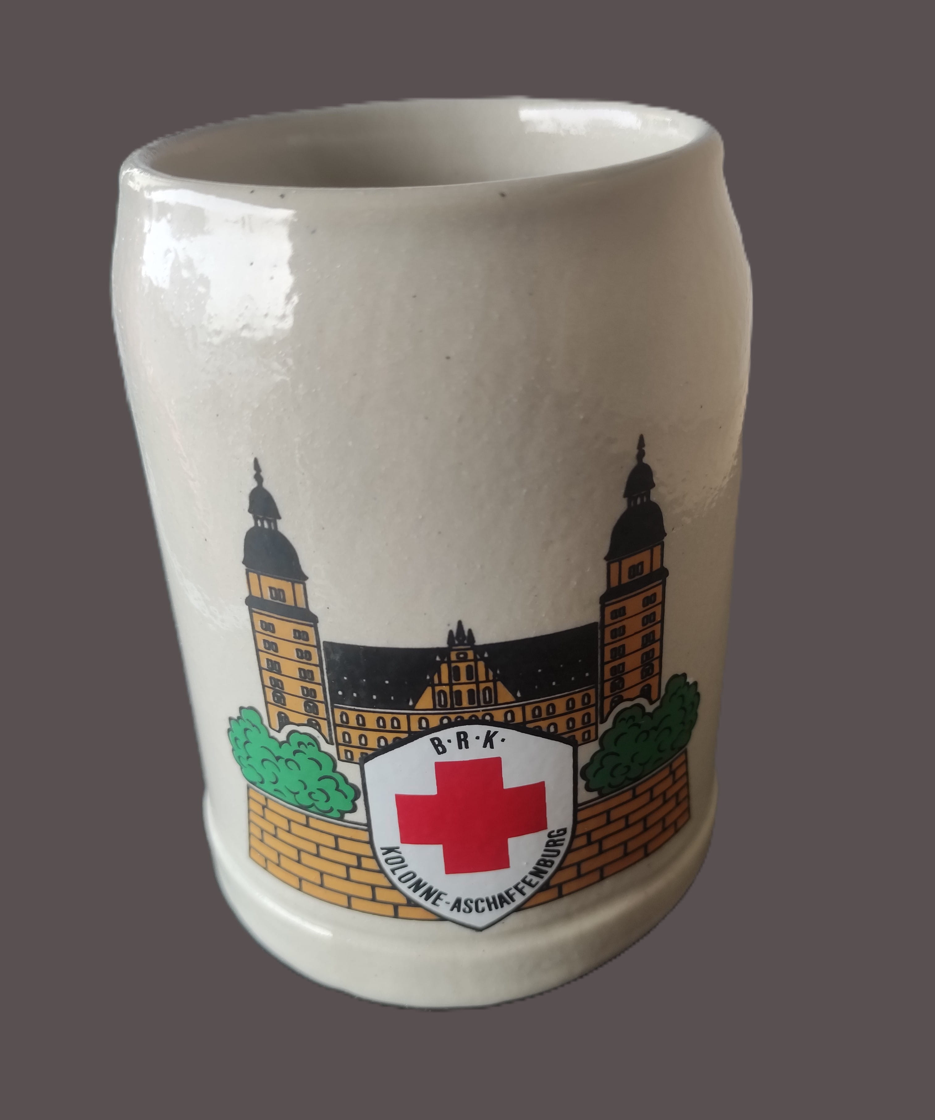 Tasarım ve Amblem: Bardağın ön yüzünde, “B.R.K. Kolonne Aschaffenburg” yazılı bir kalkan içinde Kızıl Haç amblemi yer almaktadır. Arka planda ise Aschaffenburg’un ünlü mimari yapısı (muhtemelen Schloss Johannisburg) detaylı bir illüstrasyonla tasvir edilmiştir.
