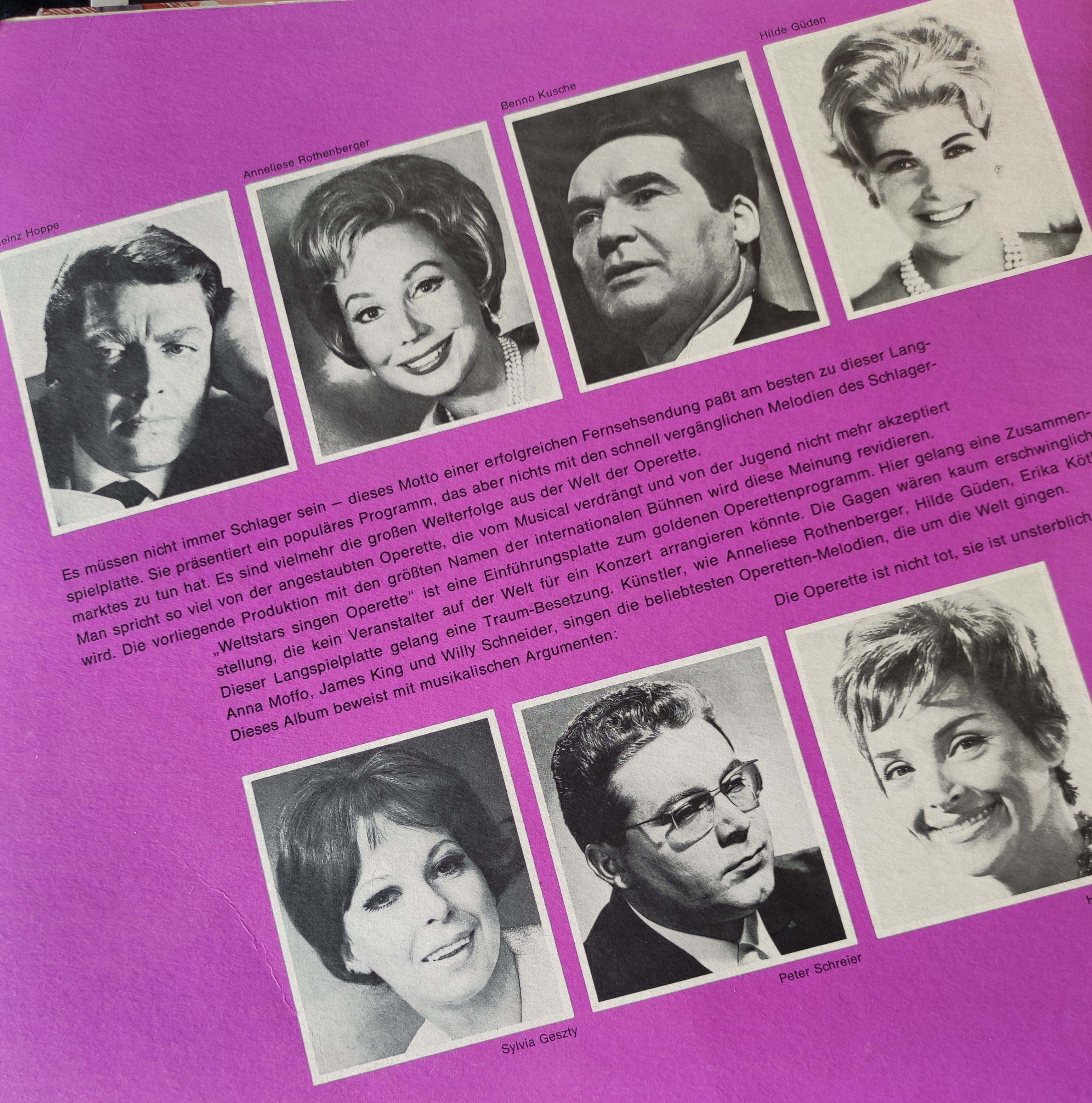 Koleksiyonluk bir parça olan bu özel uzunçalar (LP), operet dünyasının en büyük seslerini bir araya getiriyor. “Dünya Yıldızları Operet Söylüyor” (Weltstars singen Operette) serisinden olan bu albüm, hem müzikal kalitesi hem de sanatçı kadrosuyla eşsiz bir eserdir.