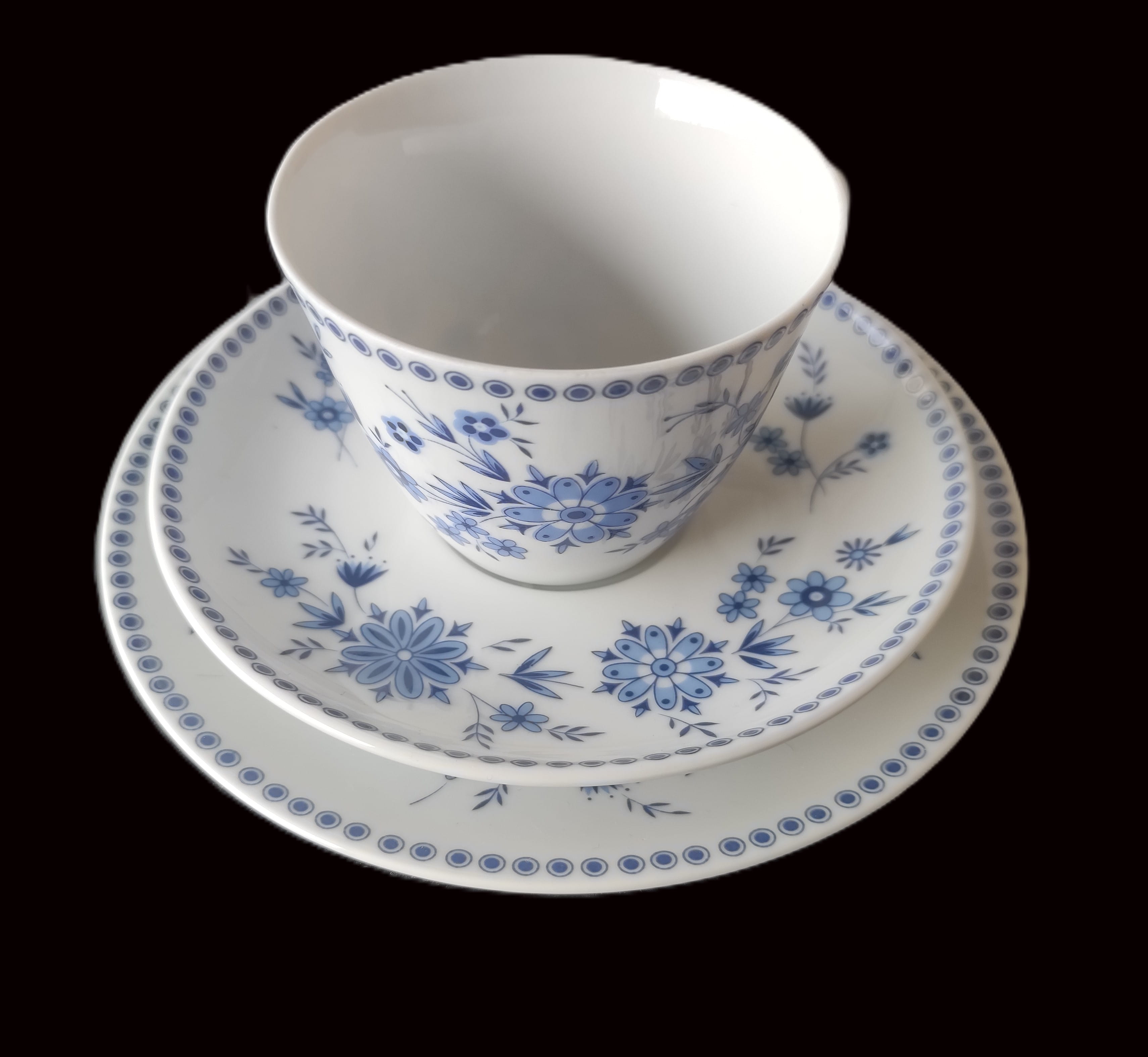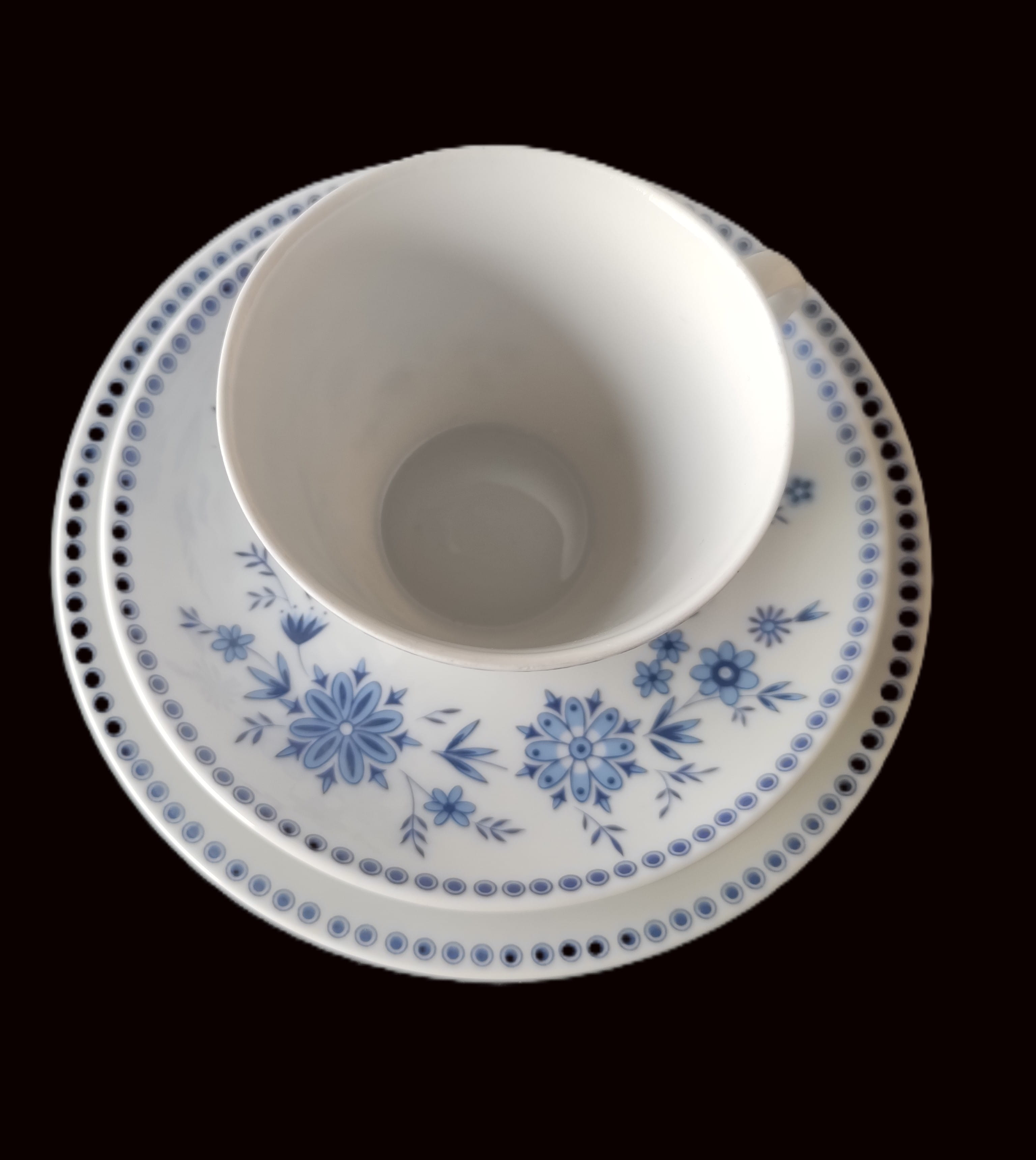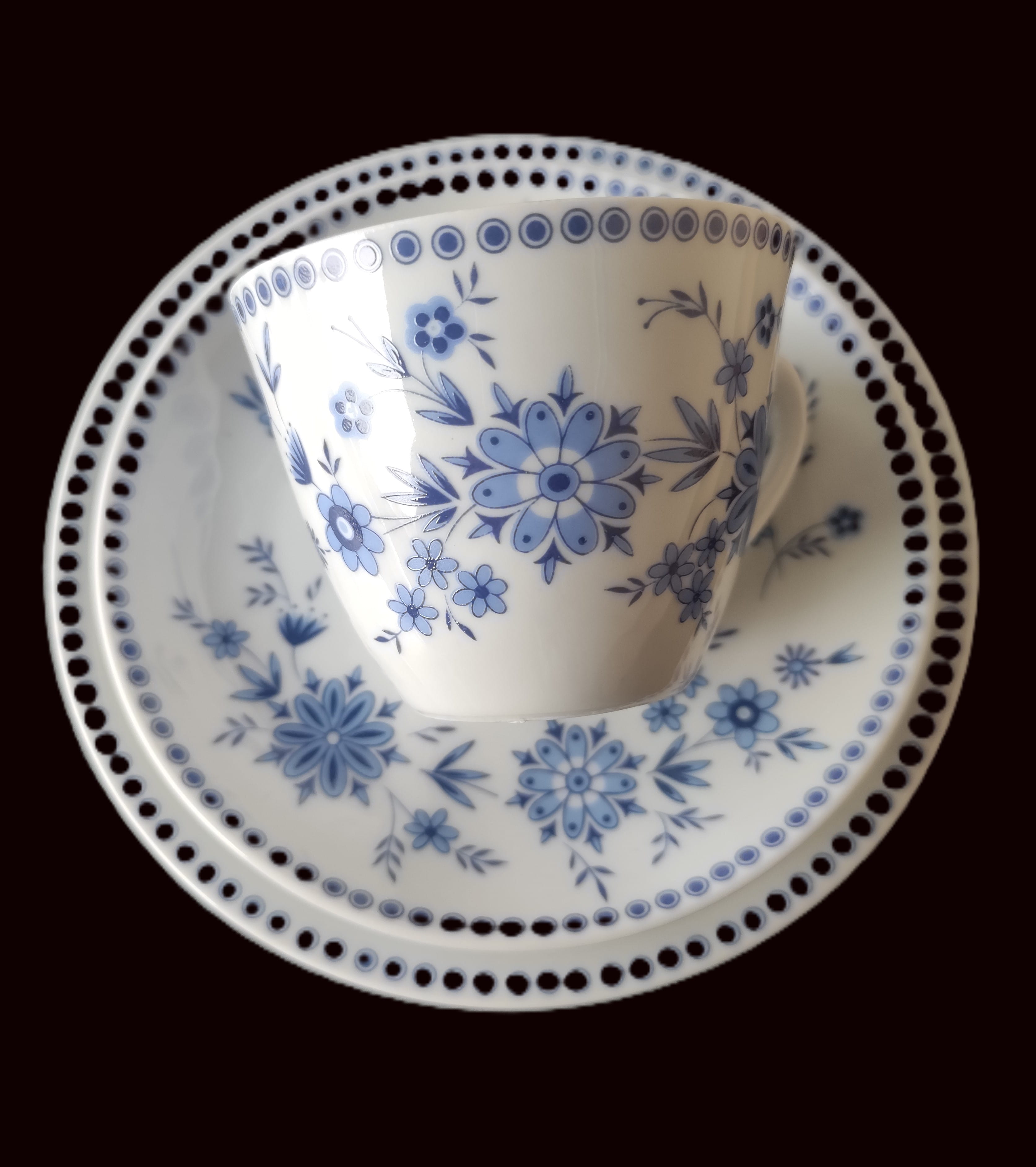 Almanya’nın köklü porselen üreticisi Seltmann Weiden’dan, mavi ve beyazın asaletini taşıyan çok şık bir üçlü set. Tabak kenarlarındaki düzenli mavi nokta işlemeleri ve merkezdeki zarif çiçek buketiyle nostaljik bir hava sunmaktadır.