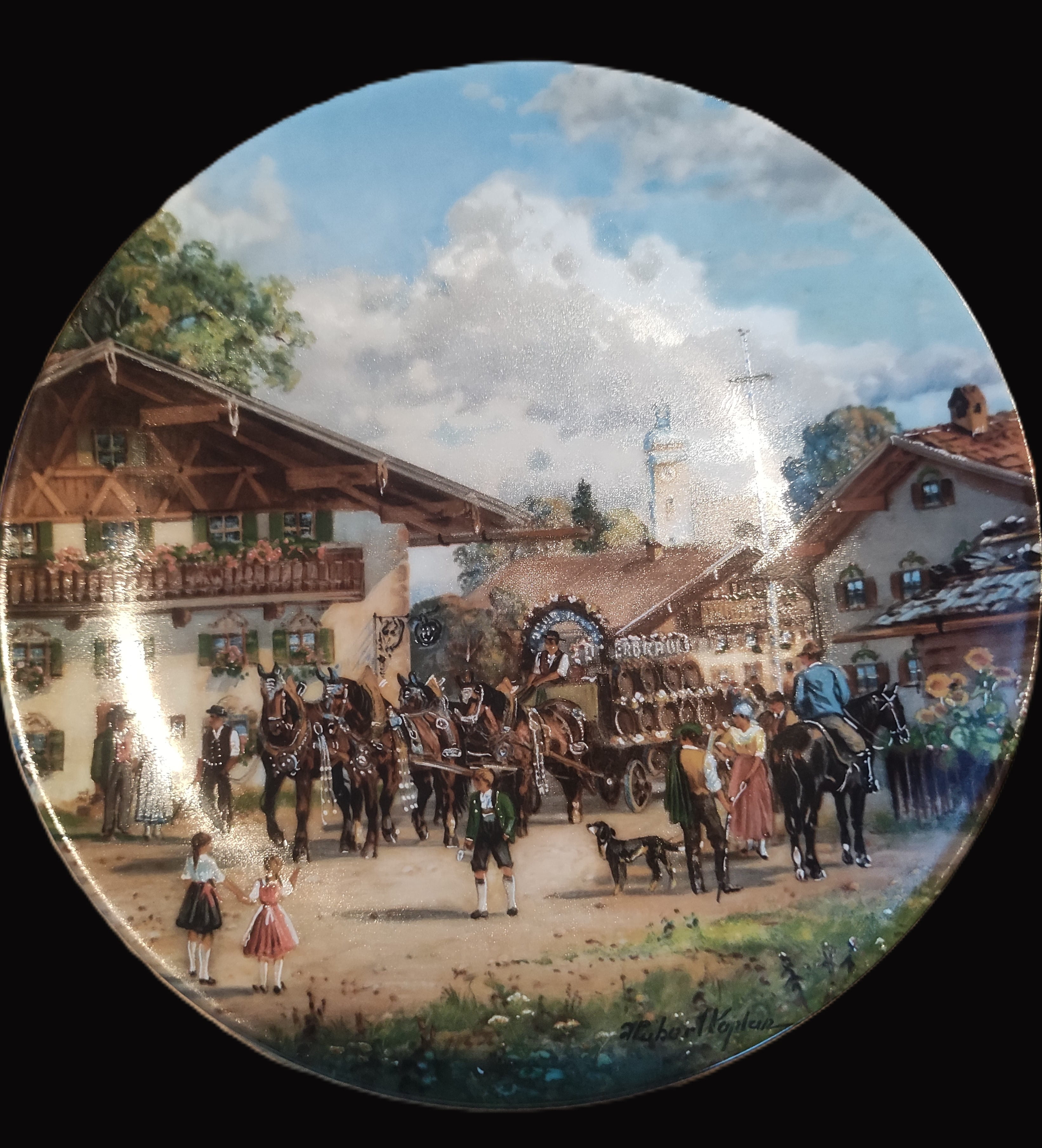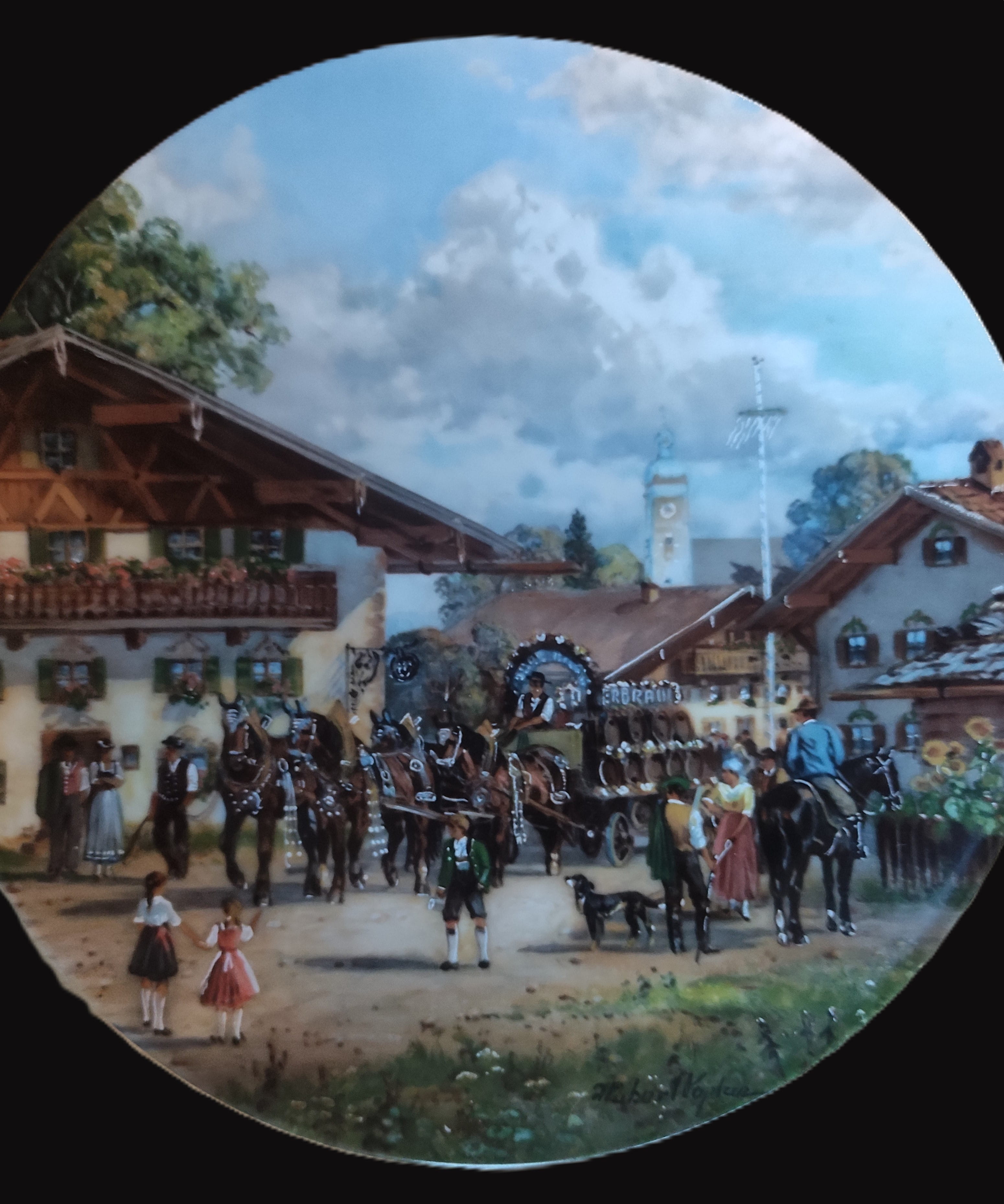 Tema: Geleneksel Bavyera köy yaşamını, festivale hazırlanan atlı arabaları ve yerel kıyafetli insanları betimleyen nostaljik bir sahne.