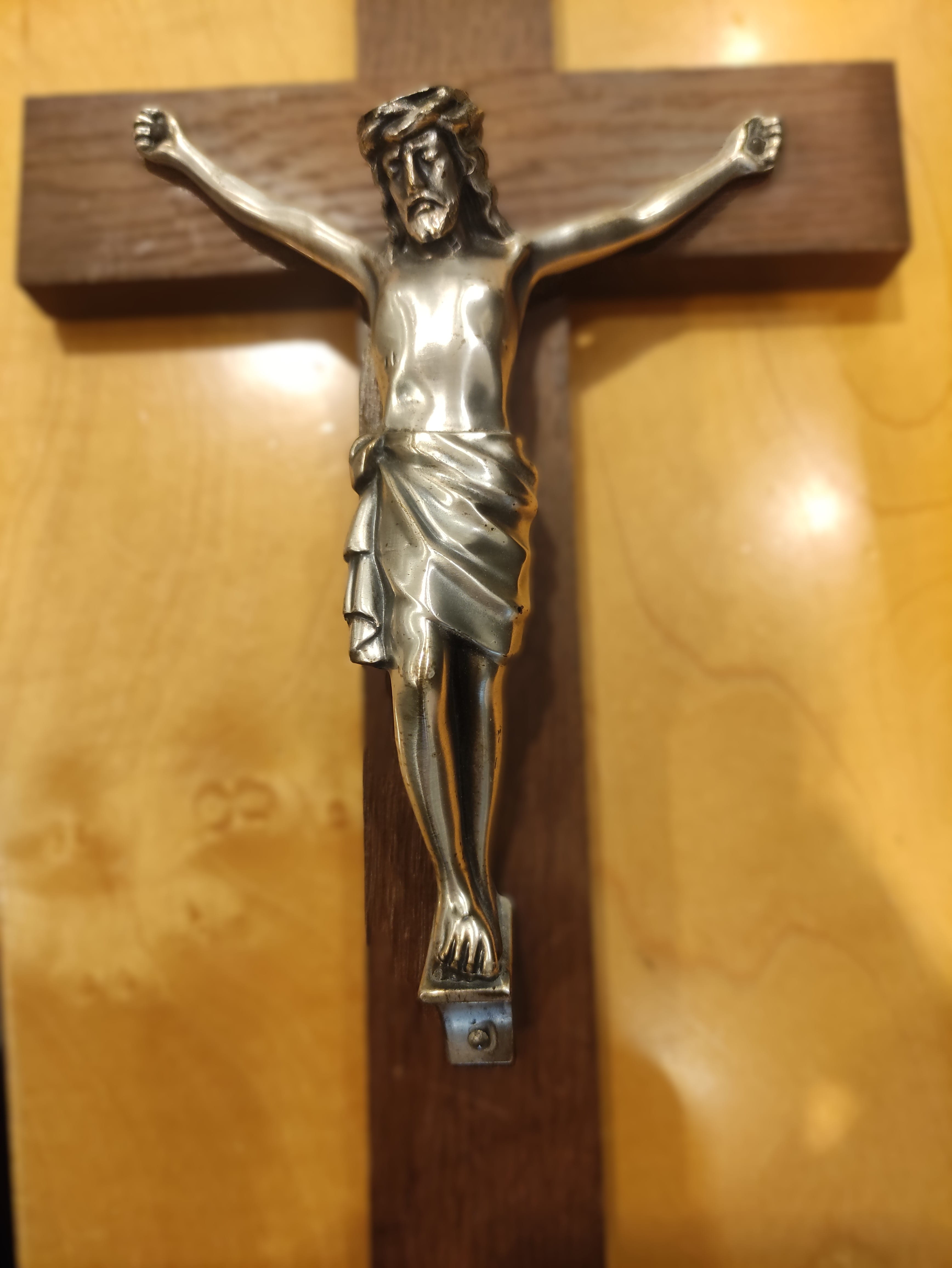 Malzeme: Haç kısmı doğal dokulu, sağlam masif ahşaptan üretilmiştir. İsa figürü (Corpus) ise dayanıklı ve parlak bir metal alaşımdan (muhtemelen pirinç) imal edilmiştir.