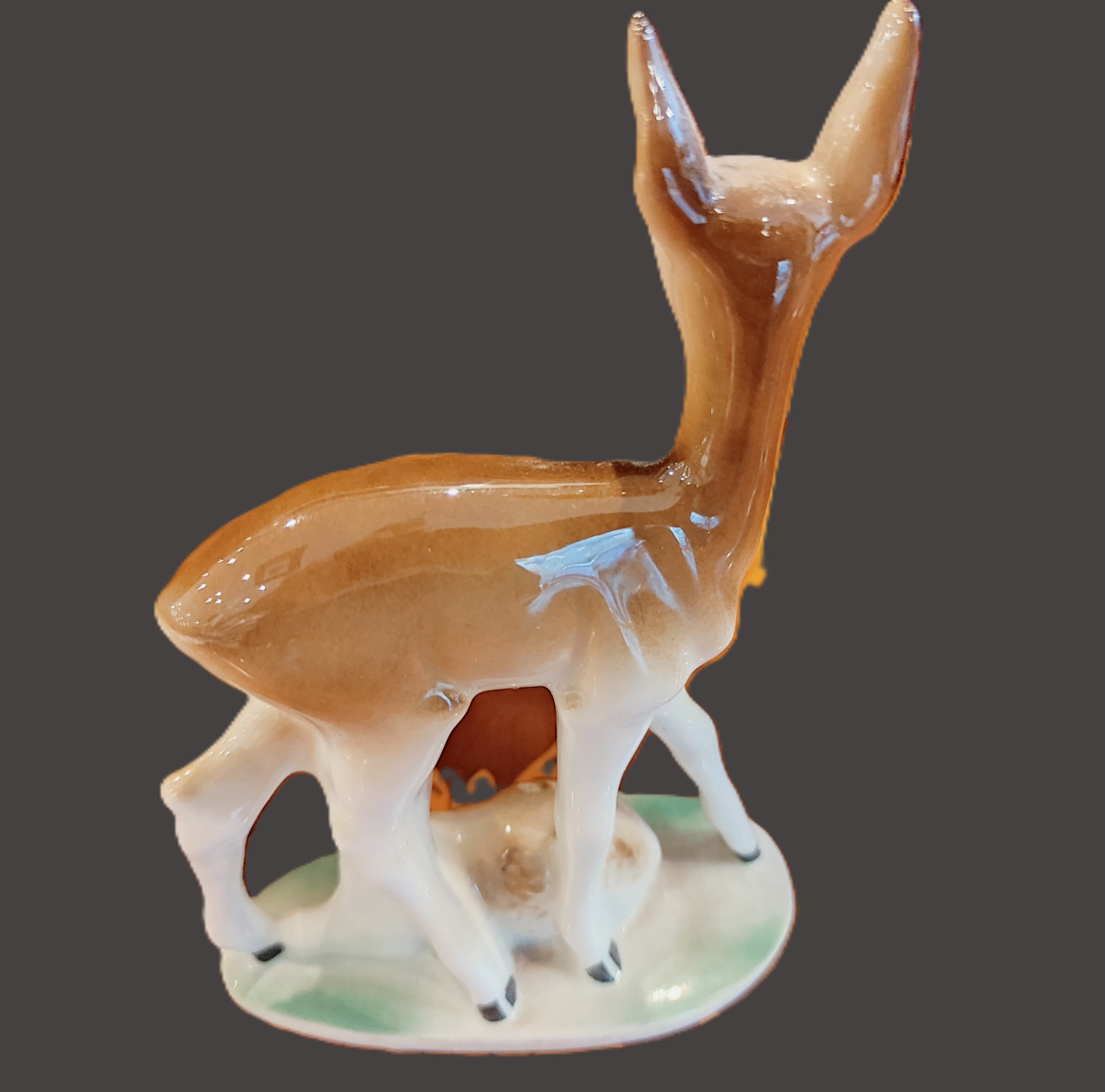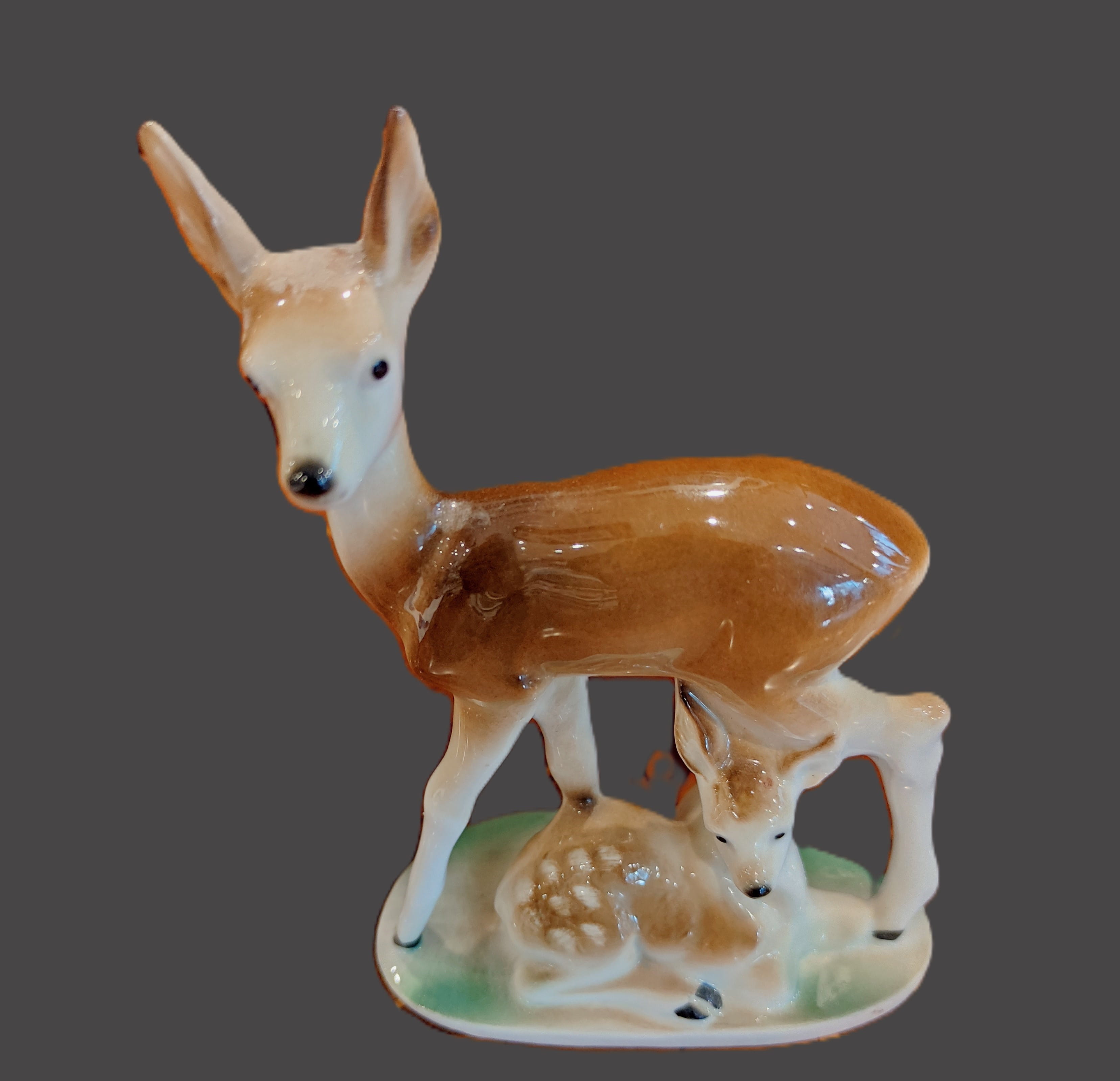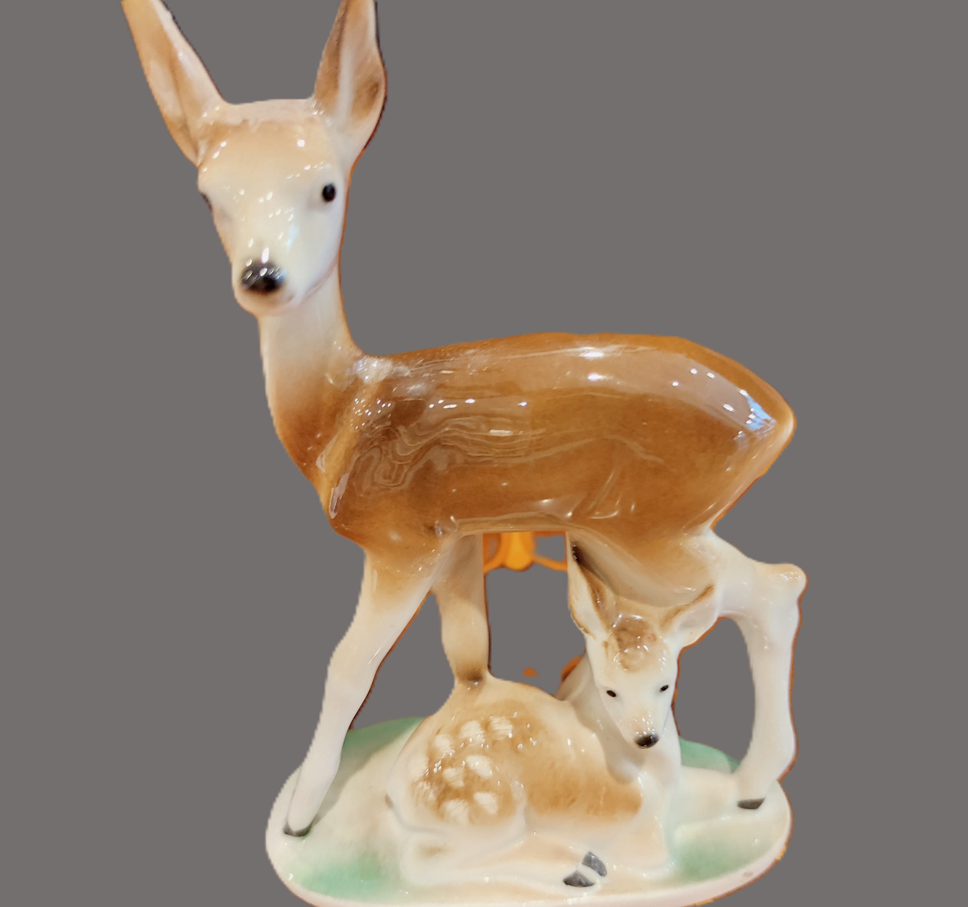 Koleksiyoncular ve vintage dekorasyon sevenler için harika bir parça! Bu zarif porselen figür, bir anne karaca ve onun yanında uzanan sevimli yavrusunu tasvir etmektedir.