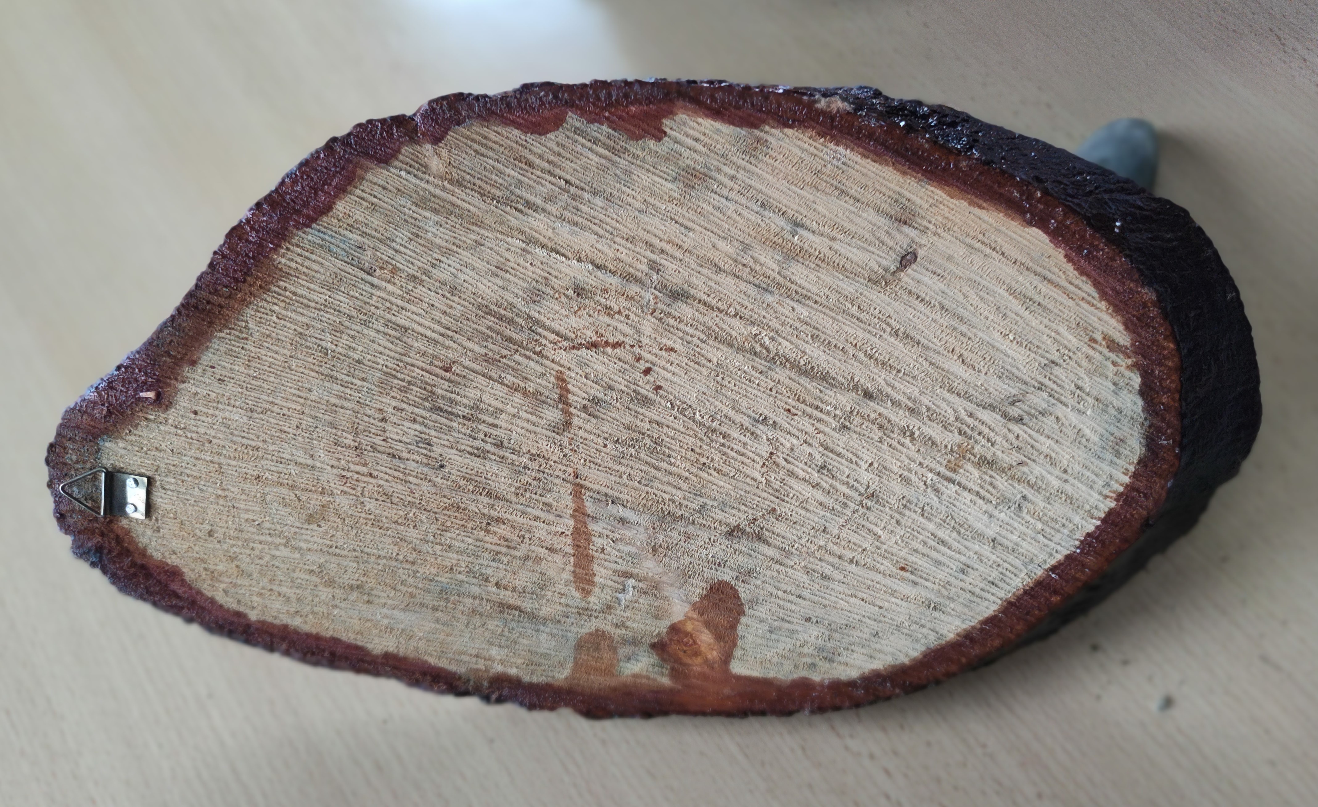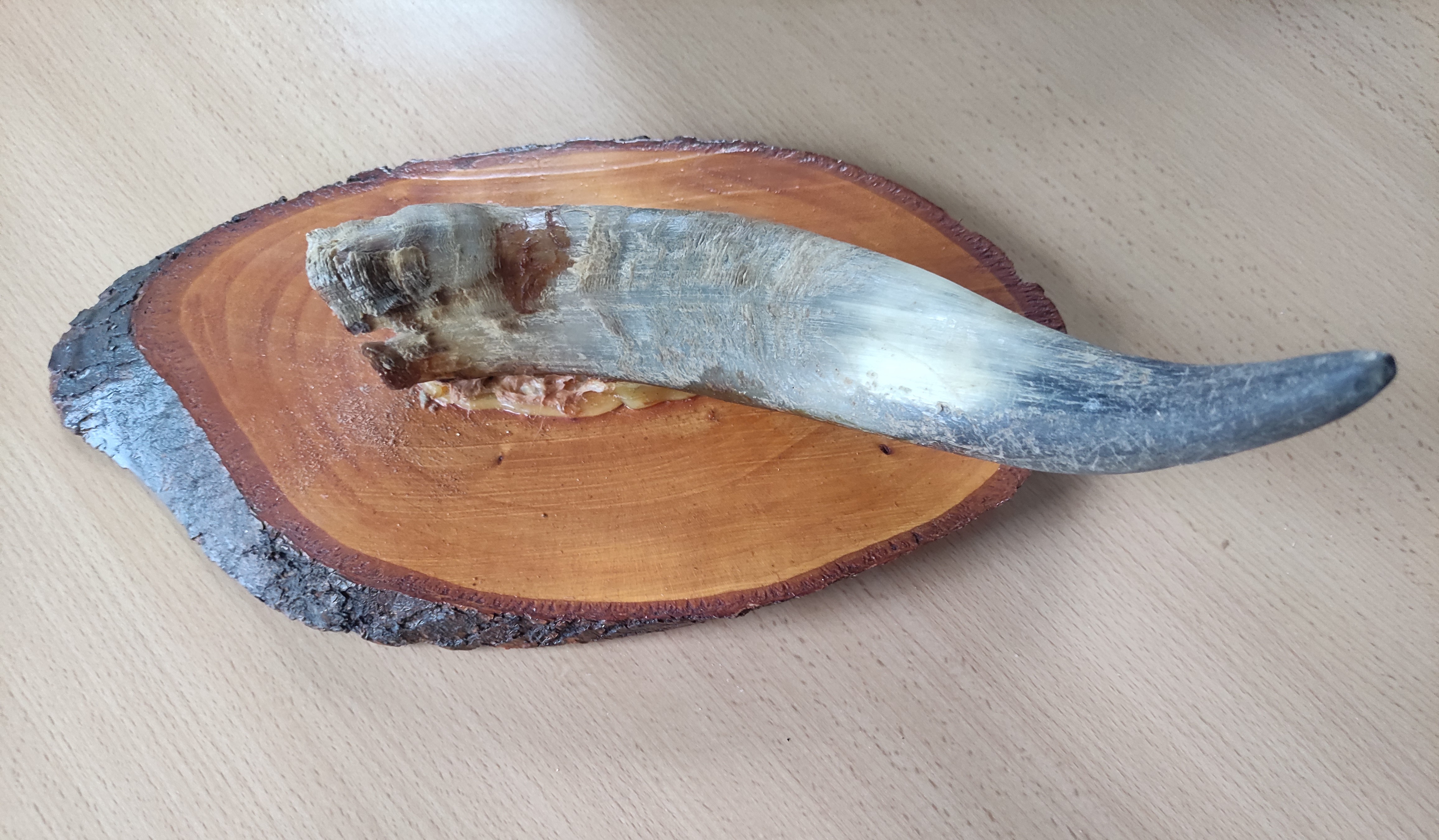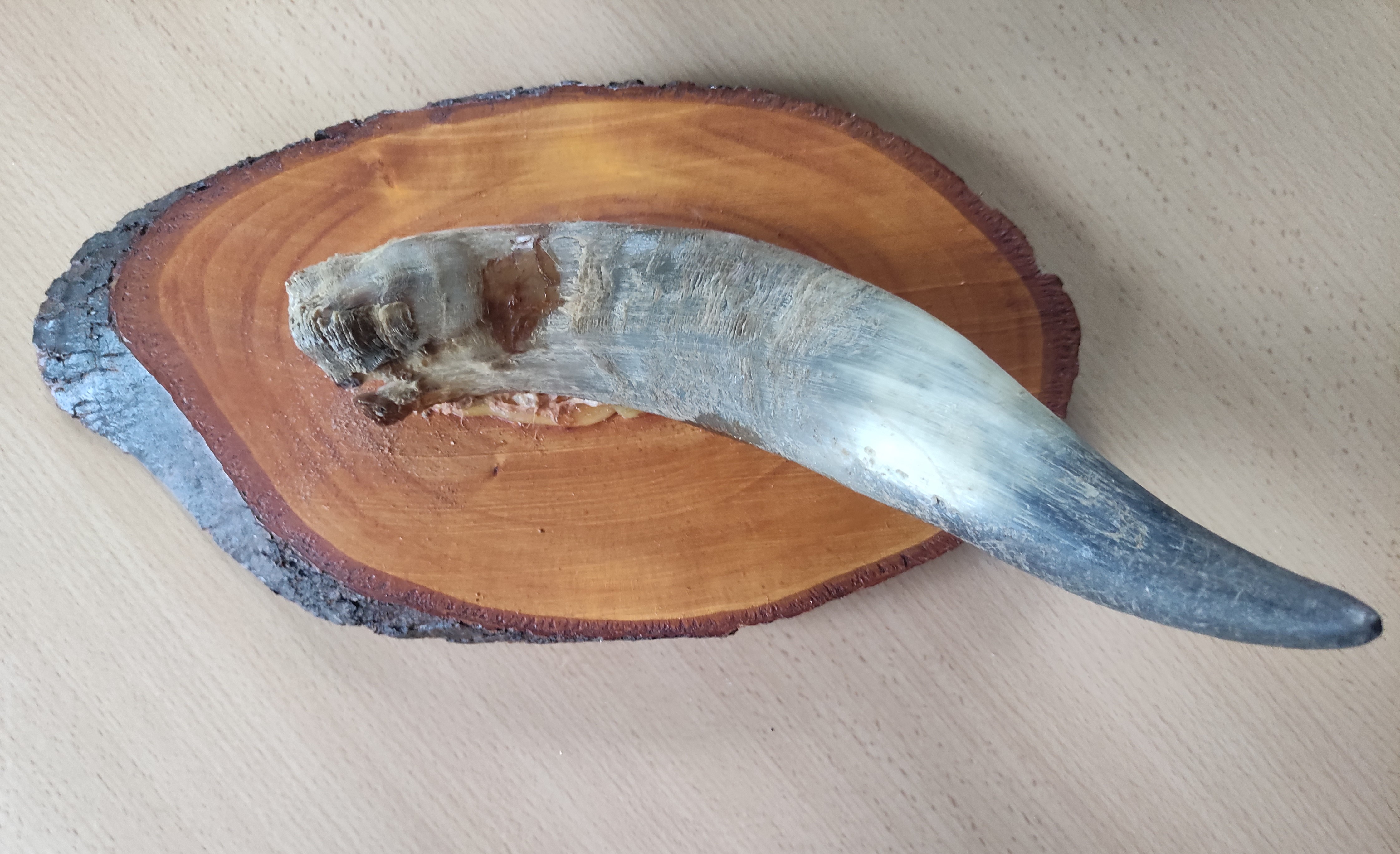 Tasarım: Doğal formunu koruyan büyük bir boynuz, şık bir şekilde cilalanmış kütük dilimi üzerine monte edilmiştir.